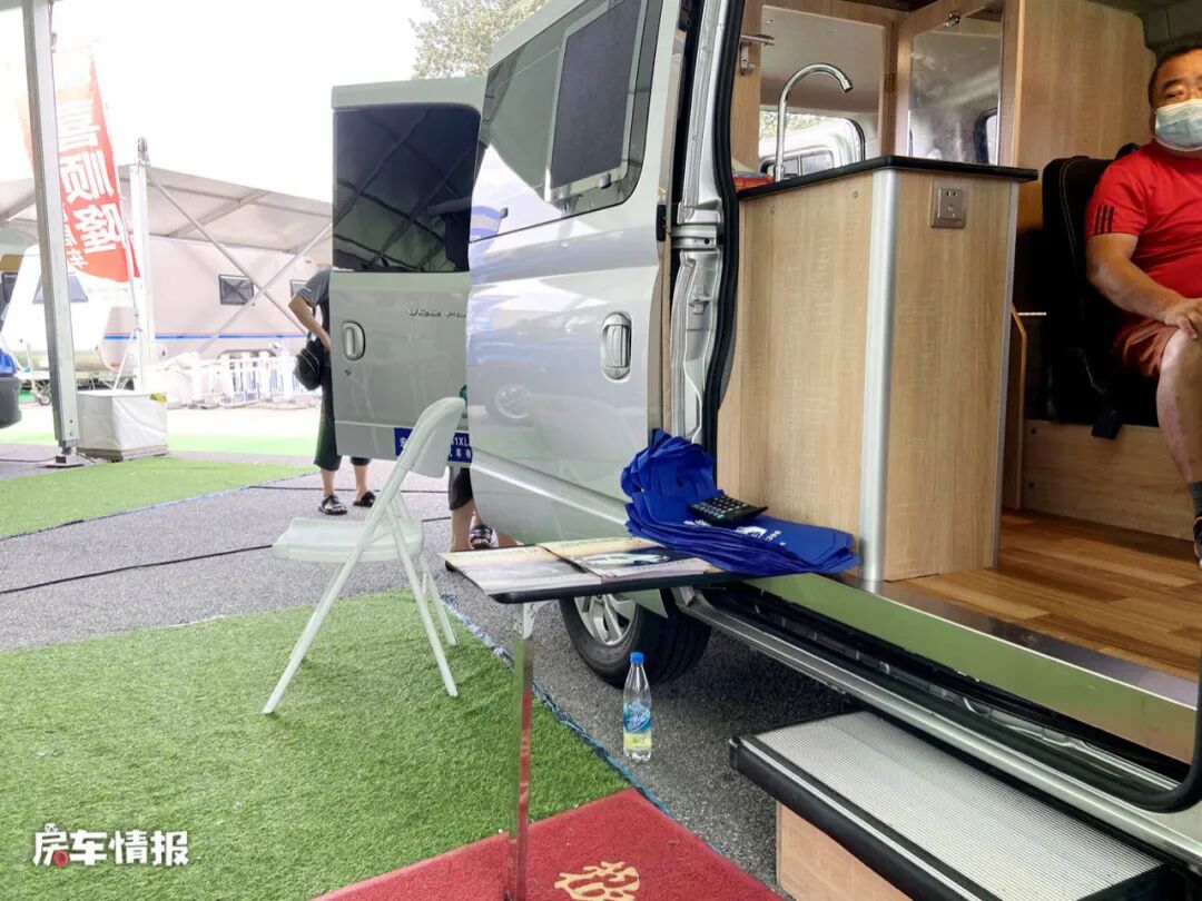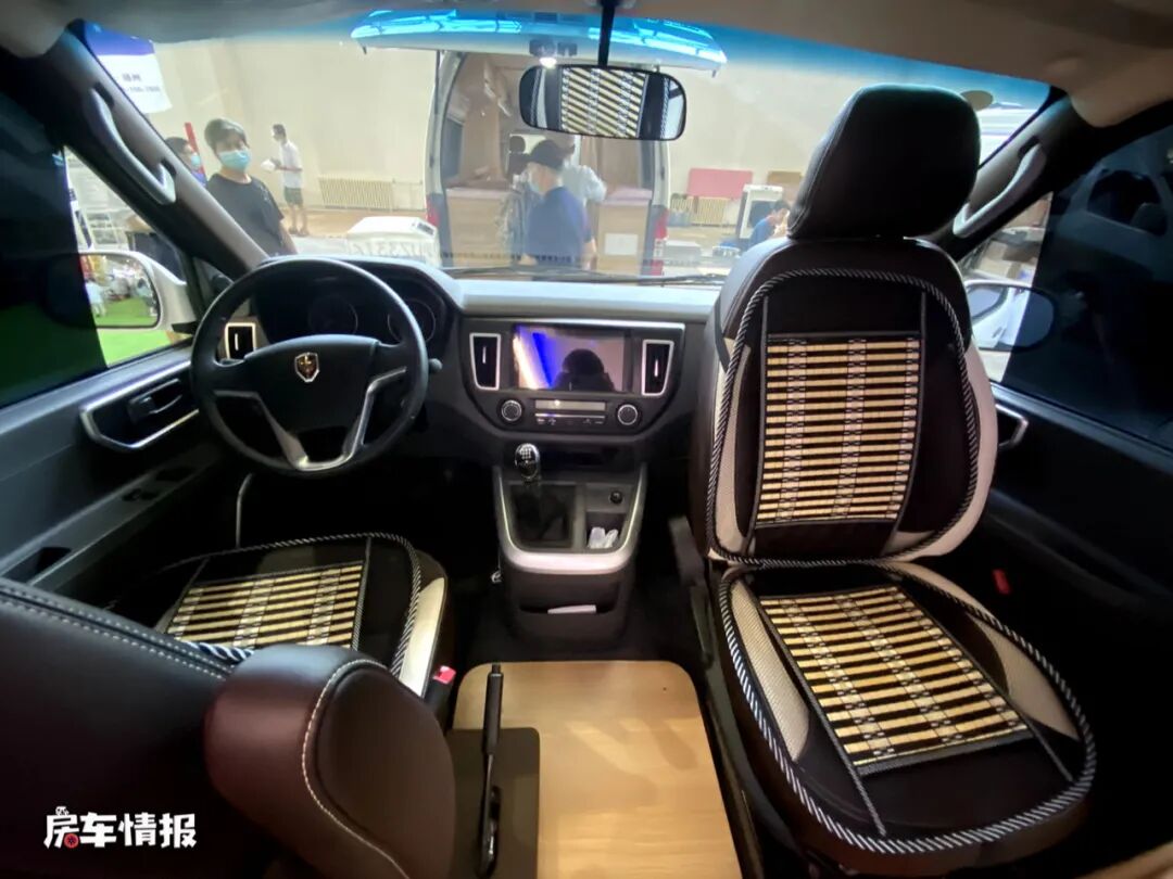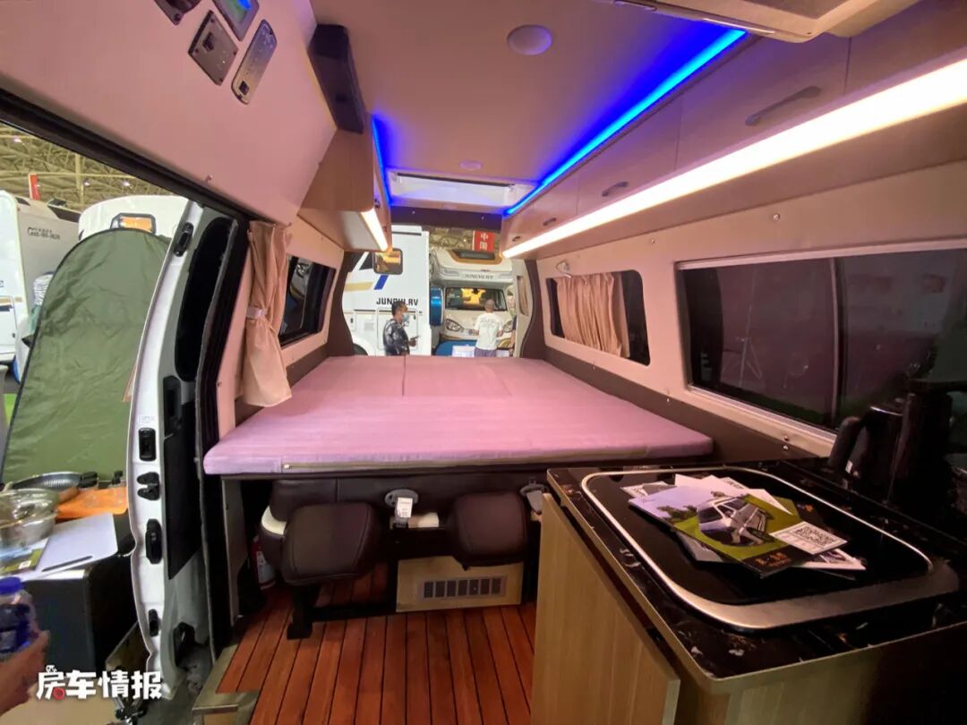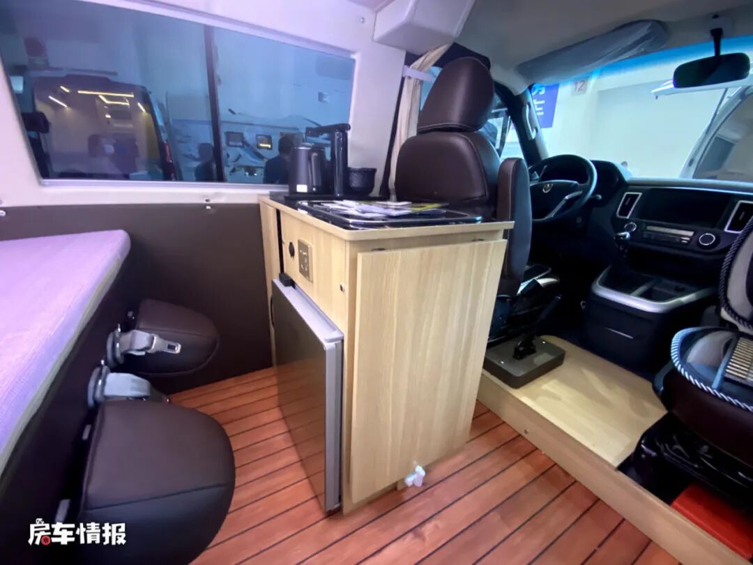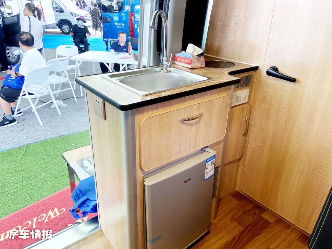 进入车厢内部可以看到车内的整体布局还是区别于其他车型的,主驾驶座椅后方的厨房操作台上提供了电磁炉和袋盖的不锈钢洗菜池,除了可以简单的做饭煮面,还充当着餐桌的功能,既节省了整车内部的空间,还非常的实用,另外也提供了一台小型的车载冰箱,可以存放简单的食物。