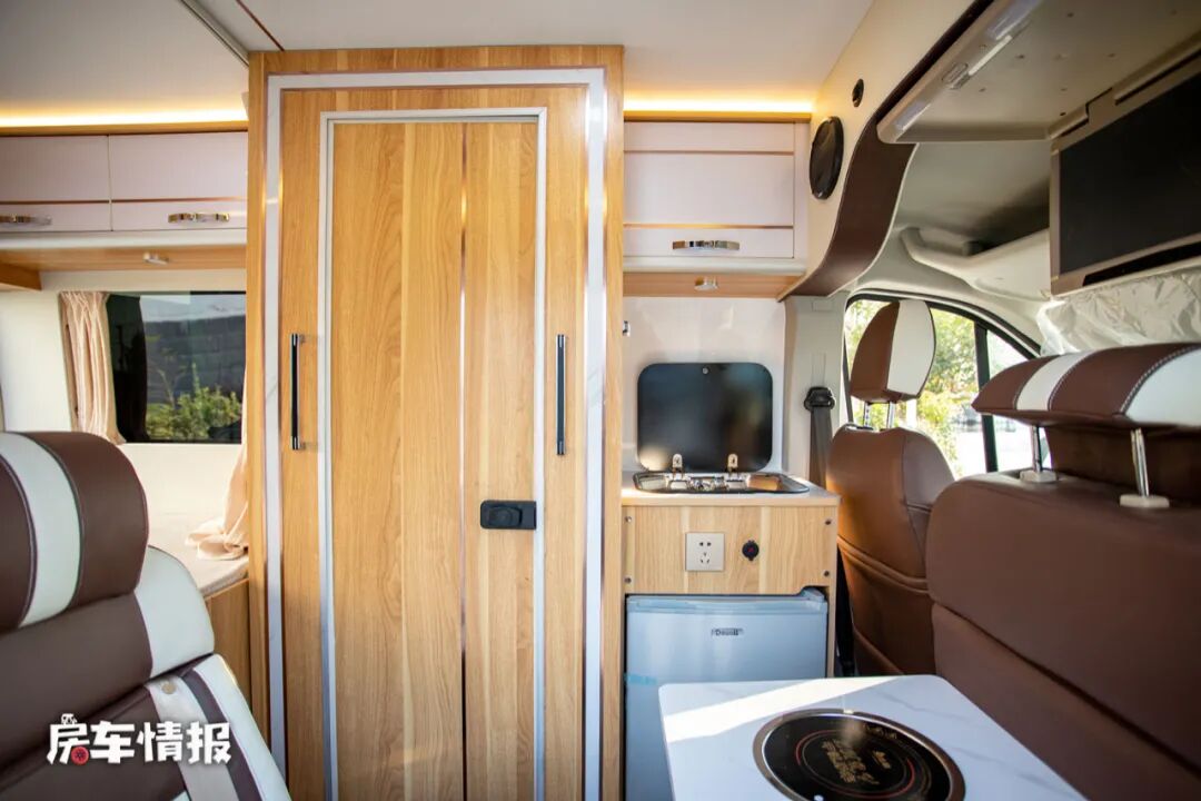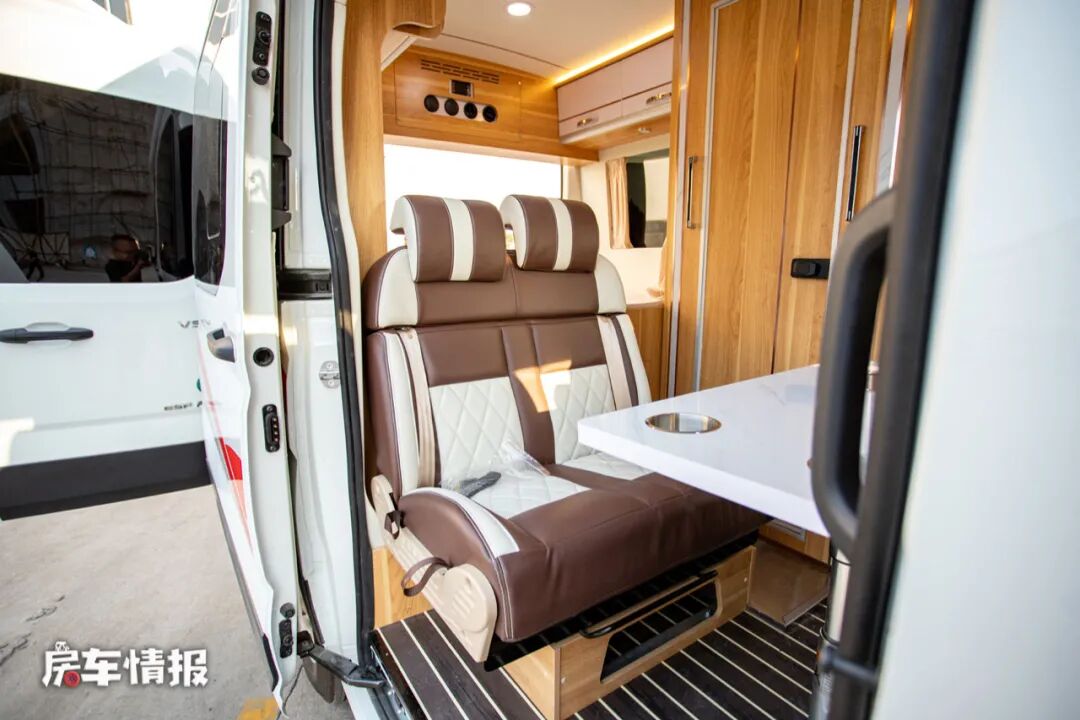 副驾驶后方同样提供了一排双人座椅,前方配置了一台升降餐桌,最特别的是餐桌上带有一个固定的电磁炉,当前方副驾驶座椅向后旋转,就可以形成一个四人对卡座的形式,在这里就餐小聚都很方便,天气冷的时候还可以坐下来一起涮火锅,想想就很惬意。