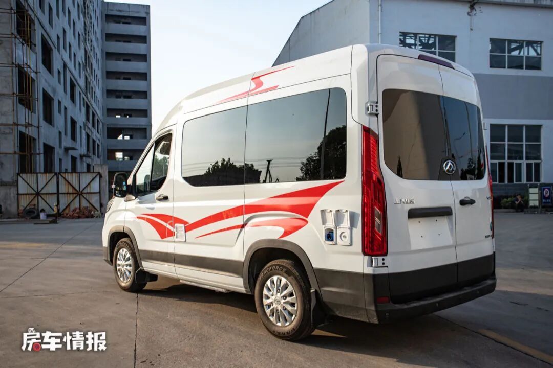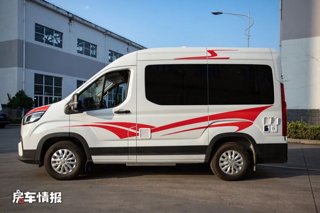 车身以白色为主色调,搭配红黑色条纹,简约低调,另外整车都采用了保温隔热处理,箱体内也全部使用了软包处理。车身外部配置则比较简单,提供了手动遮阳棚和水电接驳口,以满足为房车补给的需求。