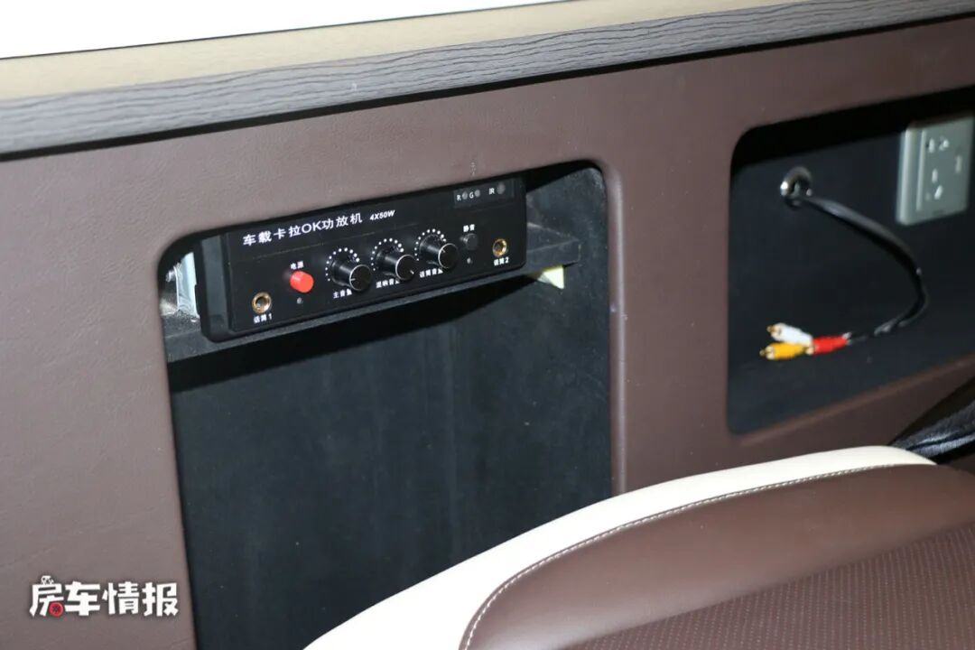 另外这款房车还匹配了一个我们并不常见的娱乐设施,就是位于座椅旁边的车载卡拉OK功放机,可以为整车内部带来更好的影音视听效果。