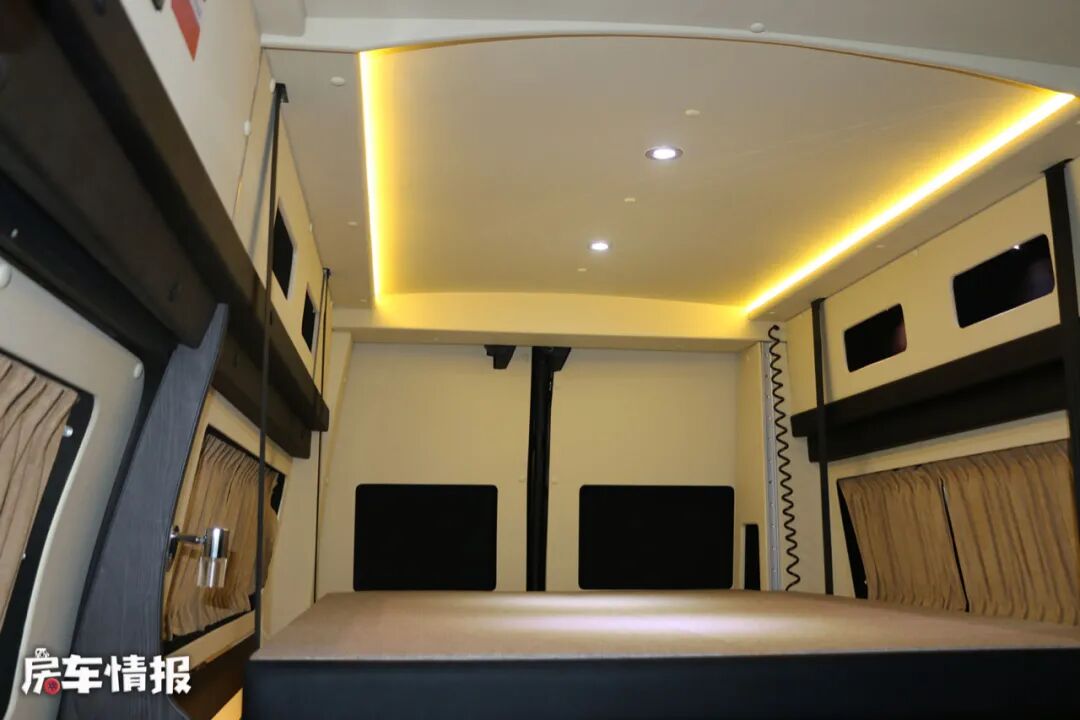 晚上睡觉时可以将后排乘客座椅全部放倒,睡两个成年人也没有问题,不过因为并不太平整,所以相对于固定的尾床来说舒适度不高,更适合午睡使用,不过这款房车在这方面采取了解决措施,就是在顶部还提供了一张双人升降床,可以为两个人提供睡觉休息的空间。