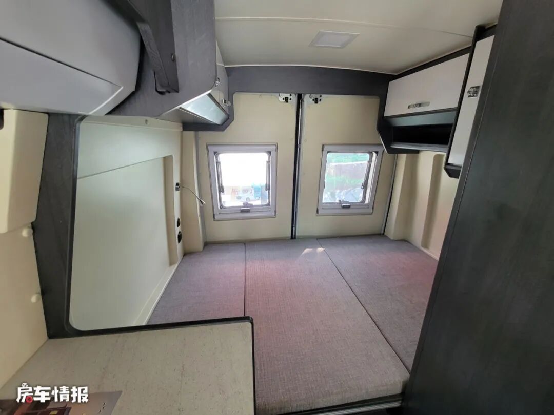 最后是位于车厢尾部的休息区,是横置双人床的设计,尺寸为1850*1200mm,也可以容纳两个成年人使用休息。车头车尾的顶部都配置了储物吊柜,可以存放平时换洗的衣物,另外床头处还带有小夜灯以及充电接口,方便平时夜里使用。