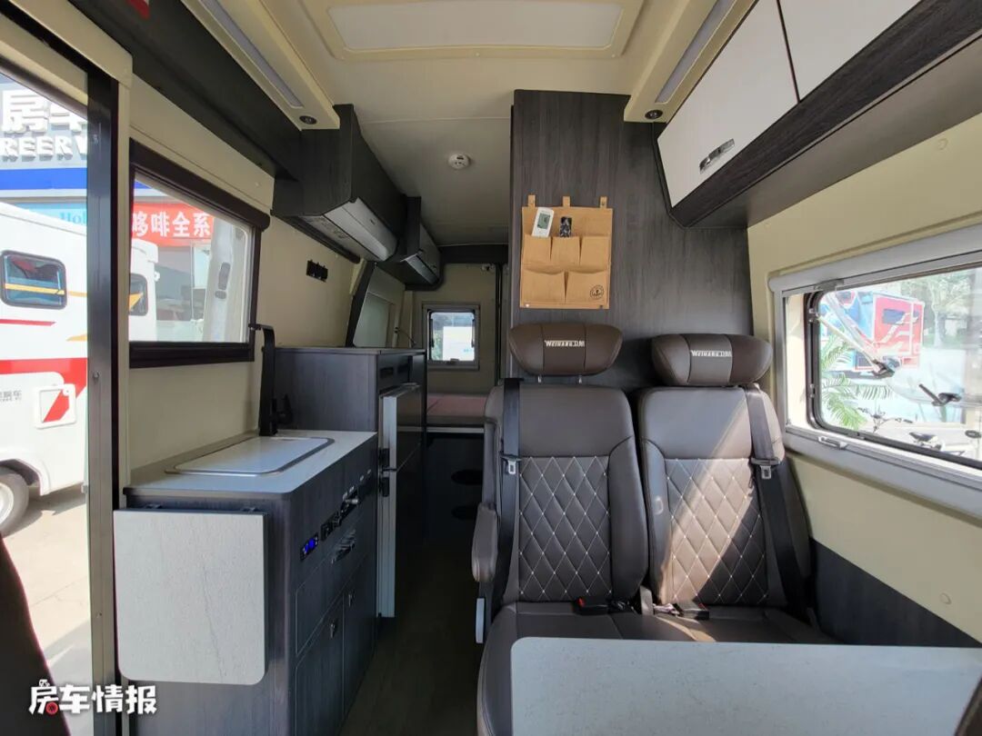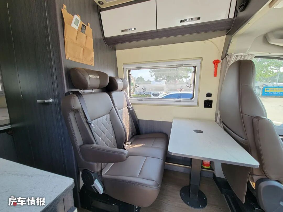 从车身右侧的乘客门进入车厢内部,整体的感觉都比较素雅,布局也采用了当下B型房车最为流行的设计。