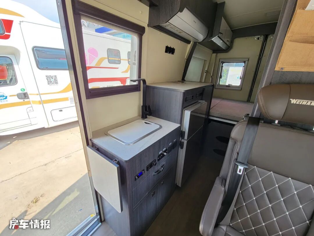乘客门处的厨房区整体面积还是不错的,前方为操作台,带有不锈钢的洗菜盆,侧面还提供拓展的小桌板,后方则是一个可以备菜的平台,下方嵌入了一台双开门的车载冰箱,也能满足平时存储食物的需求。