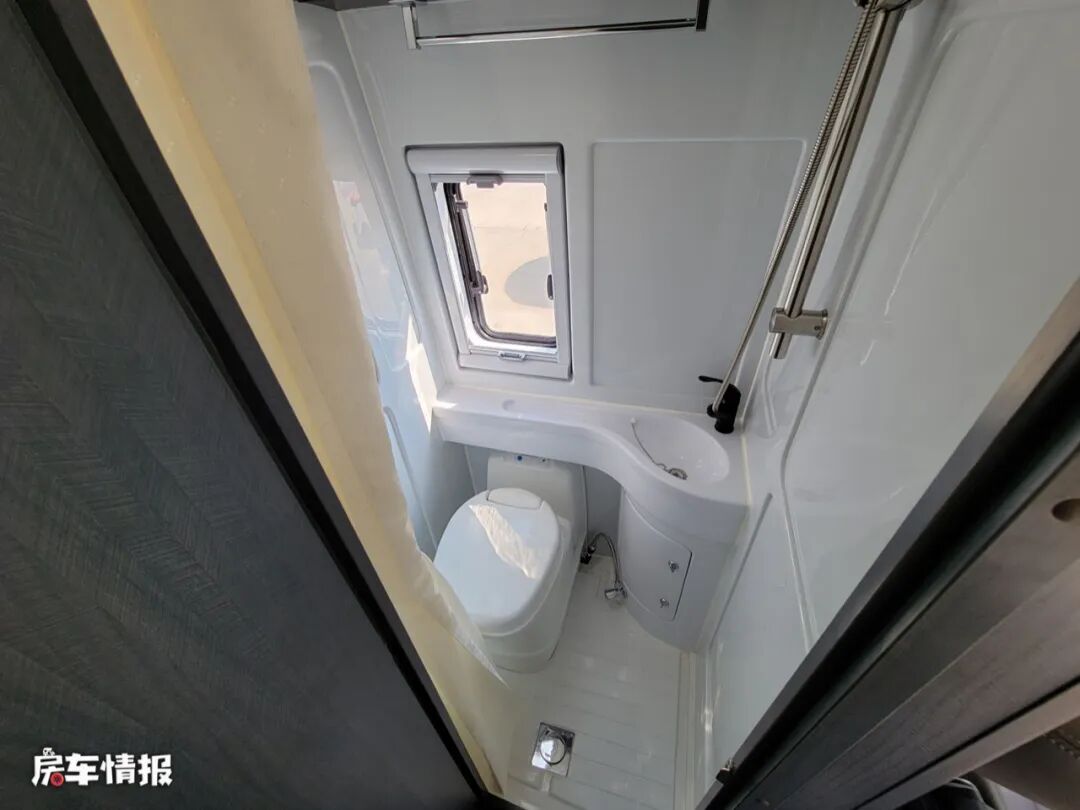 与之相对的是一间独立的卫浴室,内部提供了盒式马桶、洗手台、淋浴花洒、置物架等,可以满足出行的洗漱需求。
