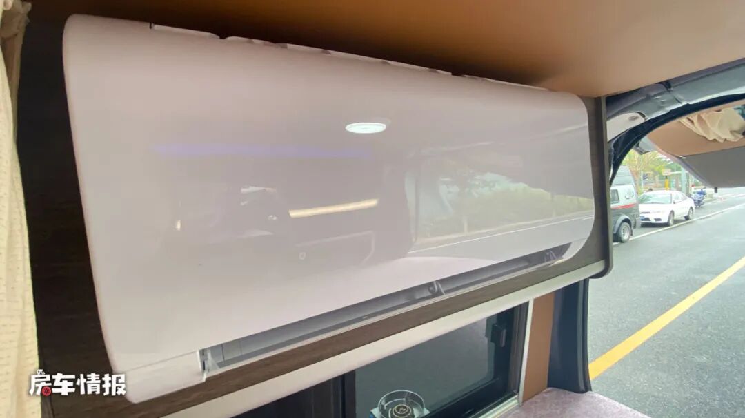 车尾部的休息区是以一张横置的尾床设计的,尺寸为1740*1300mm,也可以容纳两个身材娇小的人使用,一侧是带有变频空调,另一侧则为小型的储物吊柜,可以存放贴心的衣物,方便拿取。