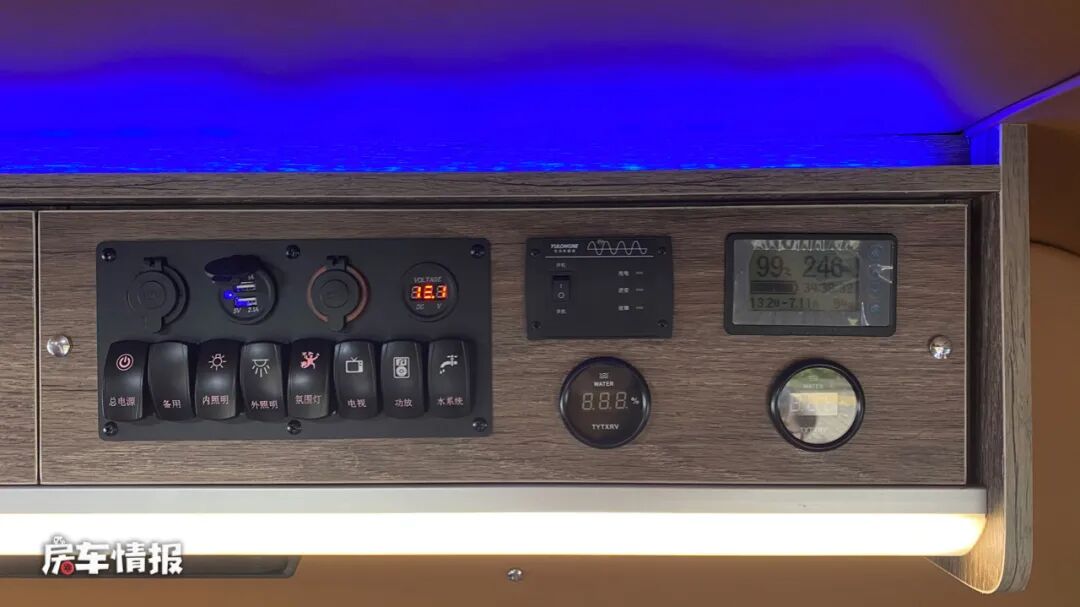 电路上,这款房车搭载了一台3000W的逆变器,提供250Ah的锂电池;水路上则拥有90L的净水箱和50L的灰水箱,两个人出行游玩使用还是可以基本满足的。