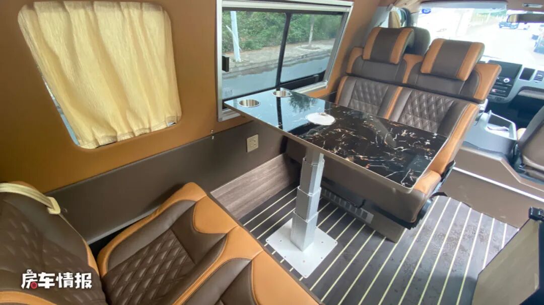 这款房车的会客区是以在C型房车中比较常见的四人对卡座+升降餐桌设计的,仿大理石纹理的桌面也突显了精致感,当晚上需要休息的时候也可以变成一张尺寸为1900*1200mm的双人沙发床,可以容纳两个人使用。