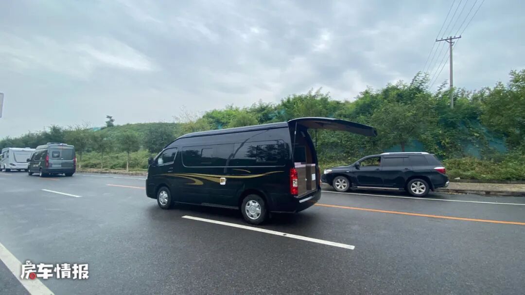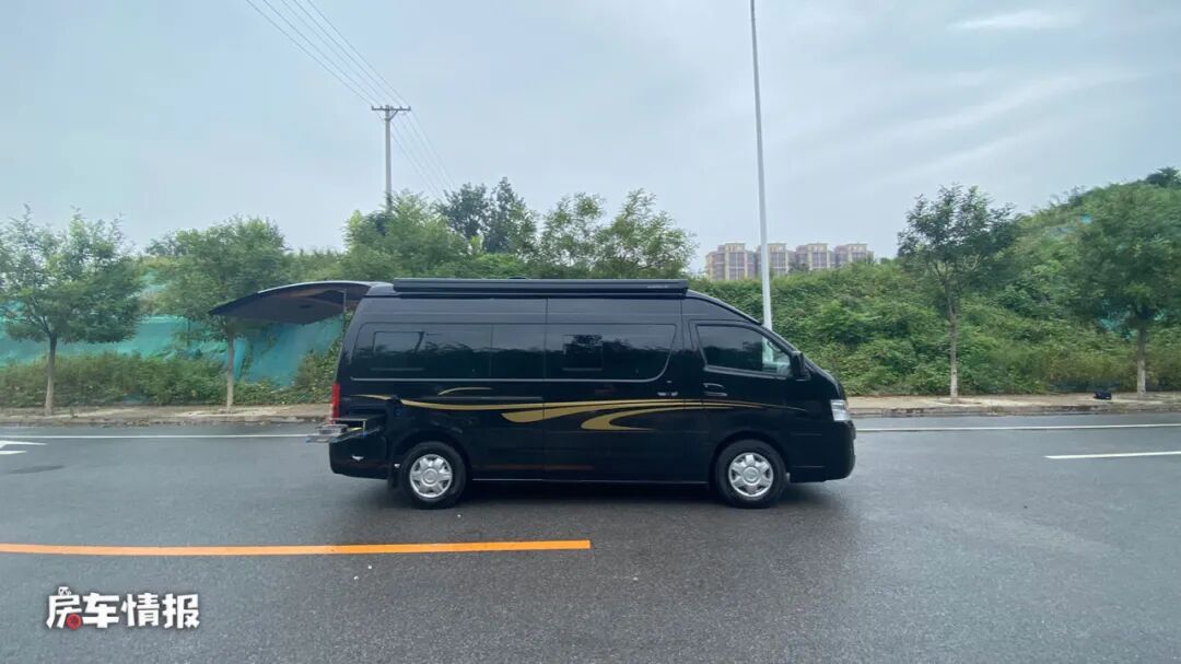 这款房车是基于中顶的福田G9底盘所打造的一款B型房车,全车的长宽高尺寸为5380*1920*2405mm,外观为全黑色搭配金色的拉花,低调的同时又彰显了简约美。