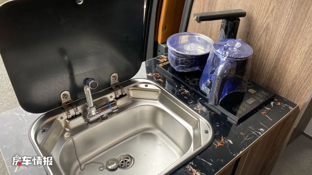 车身外部能做饭,车身内部能烧水配茶,这样的日子真的很惬意,同时在临近乘客门处的厨房操作台上还带有一个大尺寸的翻盖不锈钢洗菜盆,采用翻折式的水龙头设计可以解决整体的占用空间,侧面还提供了可拓展的小桌板,方便平时备菜使用。