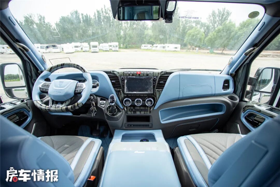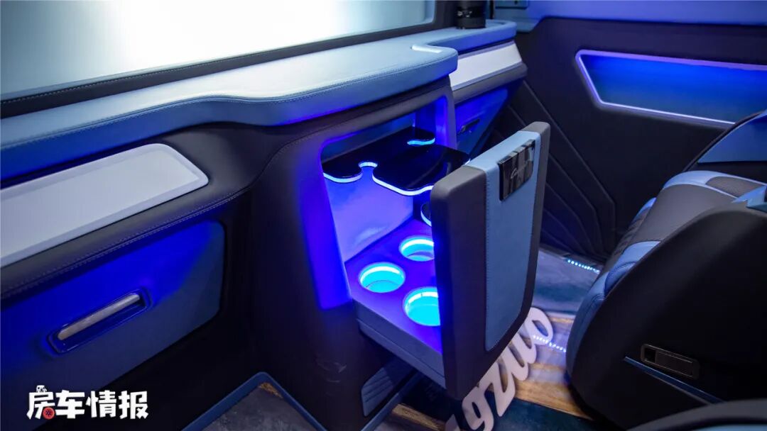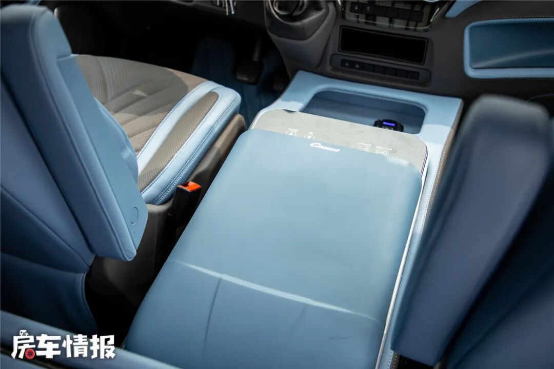 最后来看一下驾驶室,毕竟家庭出行的话,司机位置上的那位说不准就是家里的一家之主。驾驶室同样采用了和后车厢同材质同色的皮质包裹,一改朴素设计,方向盘还加入了带有水转印的实木装饰,握感挺不错,而驾驶室中部还提供了一台车载冰箱,方便存储旅行中的饮料零食。