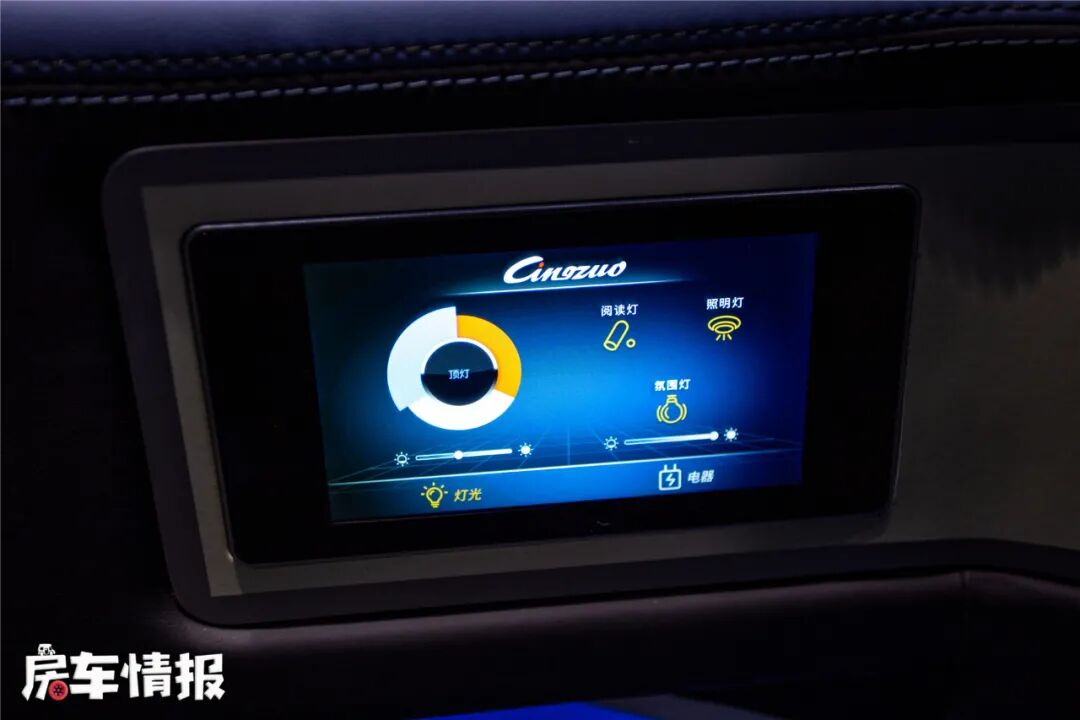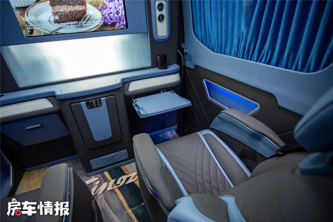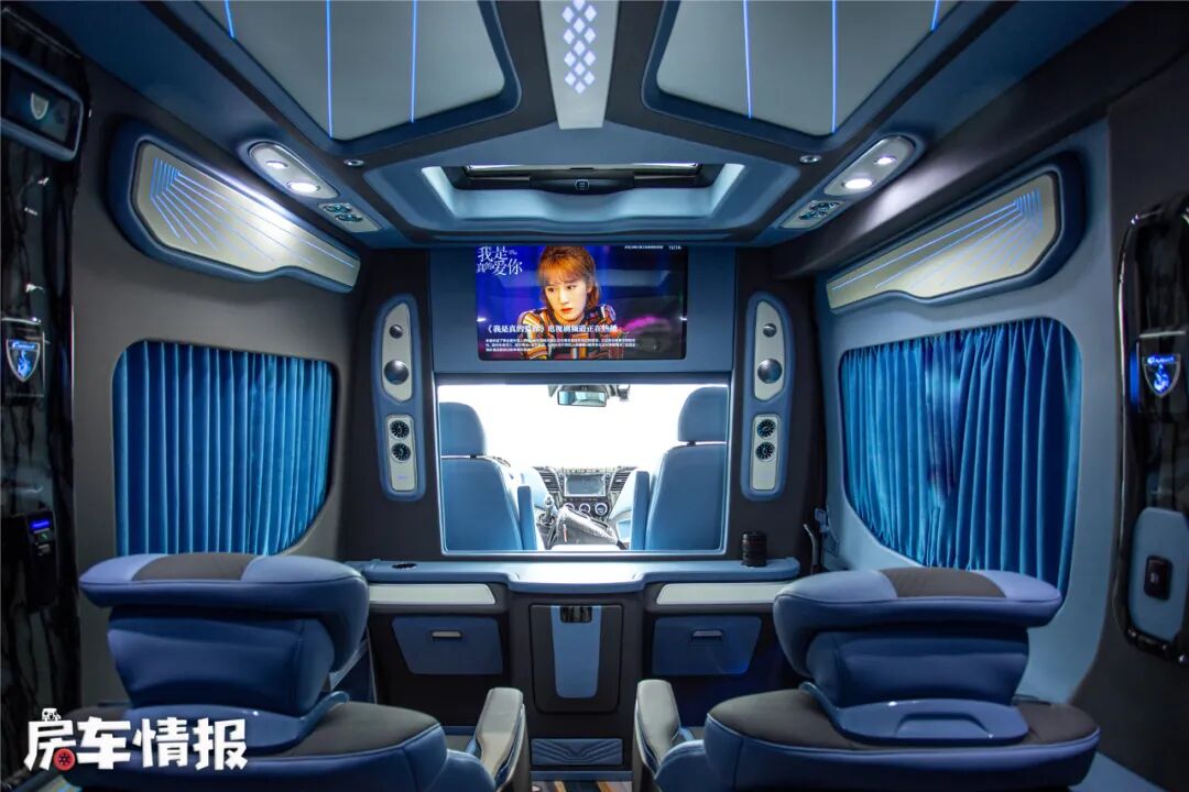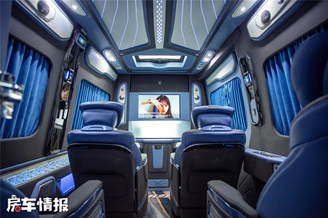 位于前方,设置了一个隔断墙,把后车厢与驾驶室分成两个独立空间,墙体上提供了升降电视、雾化玻璃等,可以根据各种使用场景进行调整。当隔断墙变为完全封闭状态时,如果想和驾驶室人员交流,还可以使用车内的通讯系统,显得挺有仪式感。