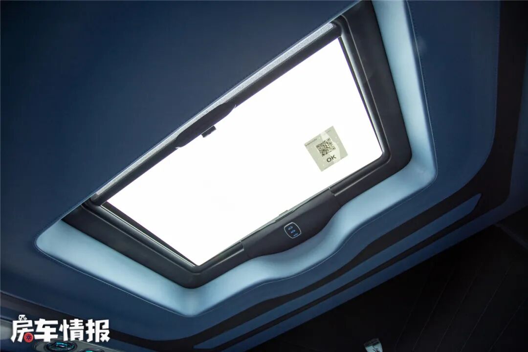 位于车厢顶部还提供了一扇乘用车上的电动天窗,可以通过遥控开闭也可以直接操作天窗上的按钮,在增加采光的同时,也能为车内快速换气。