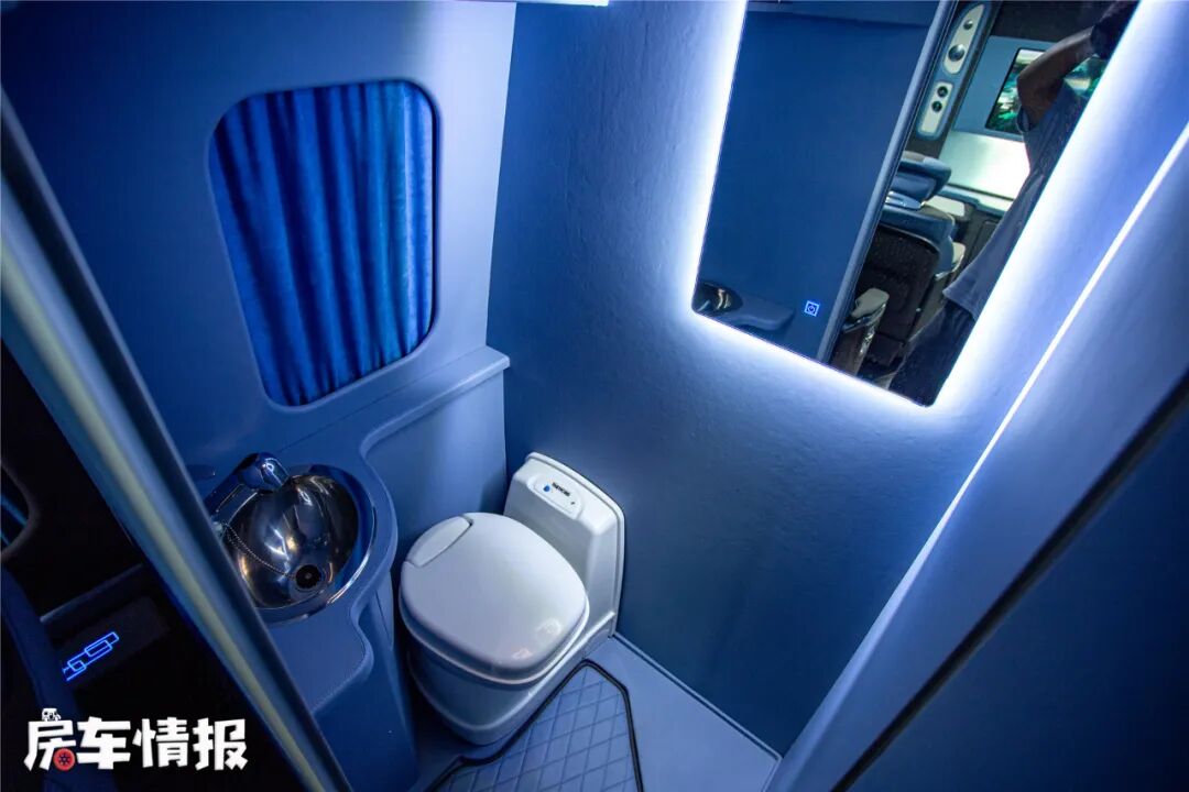 来到车厢尾部,提供了一个独立卫生间,内部提供了盒式马桶、洗手池等基础设备,搭配车上的200L净水箱和110L污水箱,即便是赶上大堵车,也不用担心闹肚子的问题。