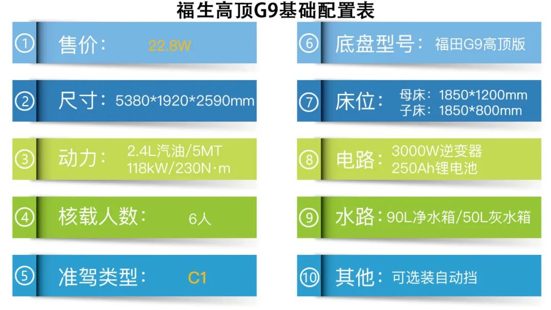 这款搭载福田G9底盘所打造的福生B型房车,现在的官方指导价格为22.8万元。