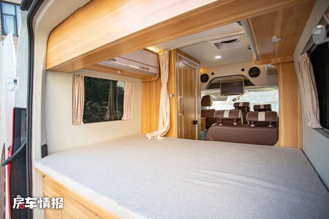 这款房车尾部休息区内的横置双人床尺寸为1780*1300mm,可以满足两个娇小体型的人使用,另外床头床尾顶部都提供了储物吊柜,可以存放一些平时换洗的轻薄衣物。床头还带有小夜灯以及USB充电接口,也方便了平时使用。