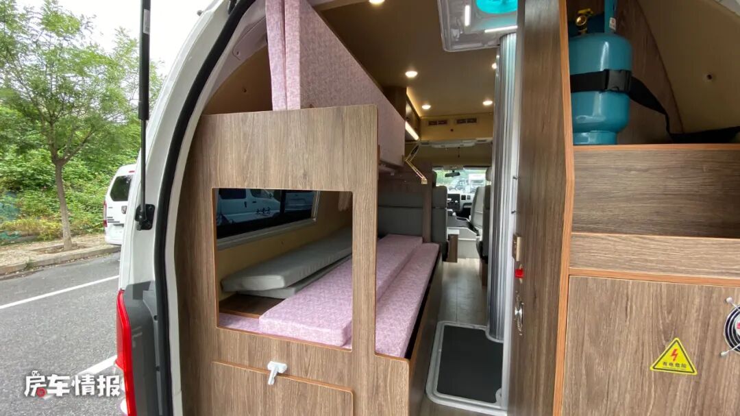 与之相对的是全车的休息区,提供了上下字母床,下床打开拓展后尺寸可达1850*1200mm,能够睡下两名成年人,上床的尺寸为1850*800mm,能够躺下一名成年人,如果不需要上床也可以翻折起来,为下床留出更多的空间。