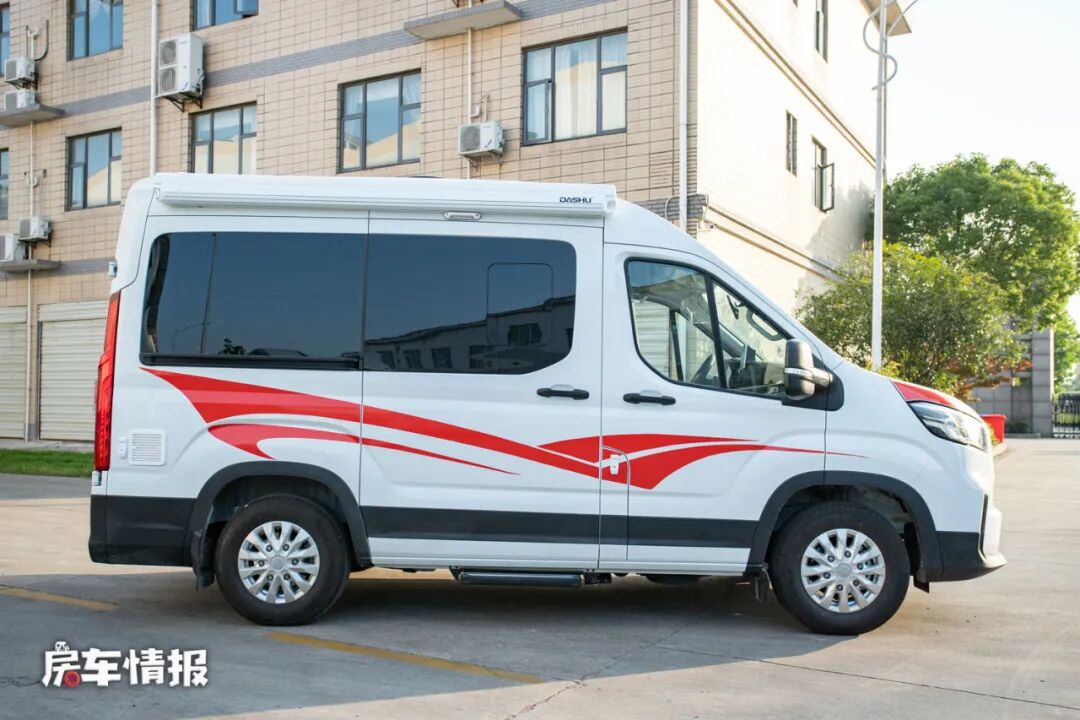 全车采用白色为主色调,搭配红色的拉花,简约又大气,车外部提供了遮阳棚以及水电接驳口,满足基本所需。