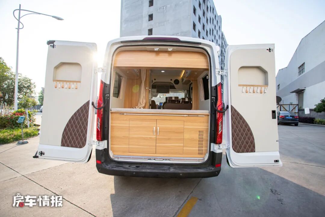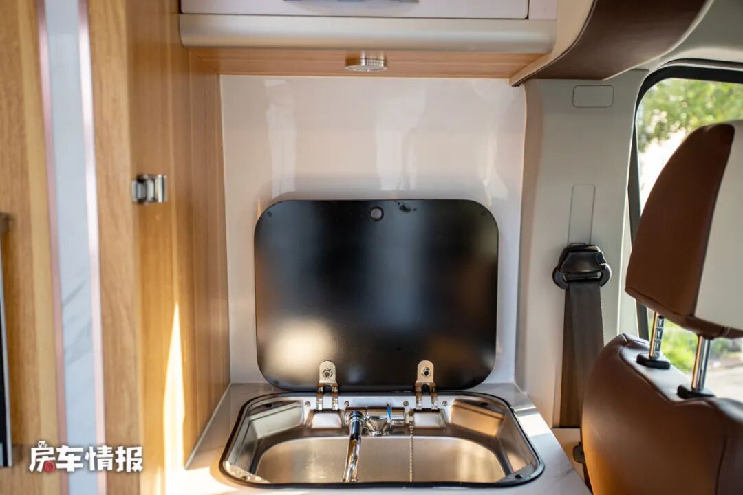 而厨房区域是被放置到了主驾驶的后方,提供了带盖的不锈钢洗菜盆和50L车载冰箱,整体还是可以满足基本的烹饪需求的。