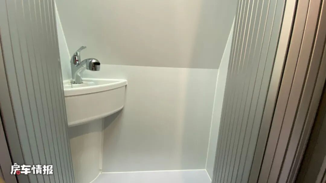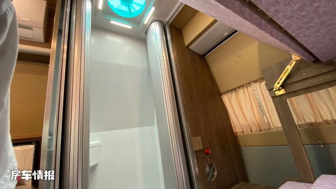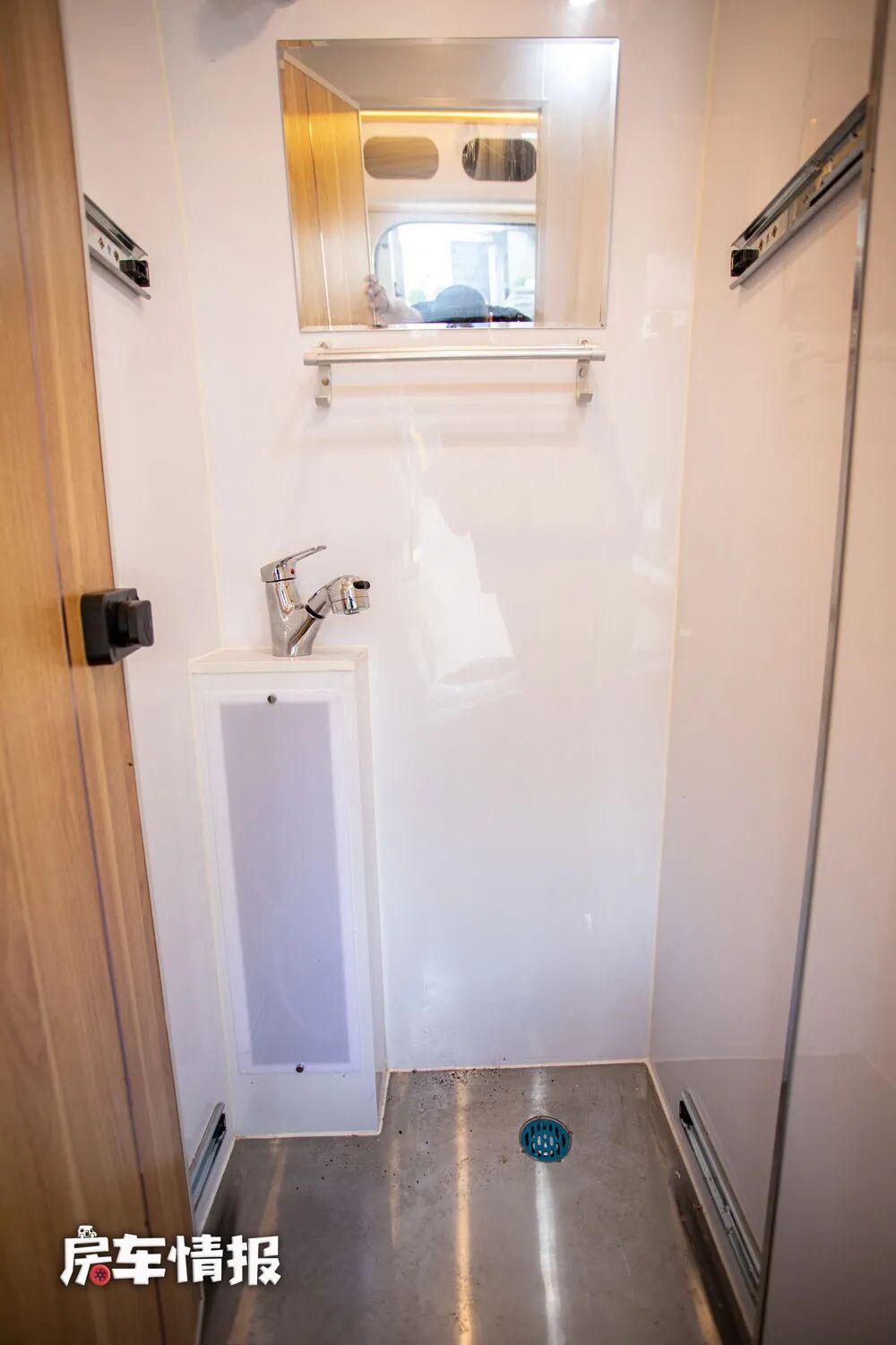 厨房区后方是全车的卫浴室,提供了淋浴花洒、梳妆镜、置物架、换气扇和便携式的马桶,也可以满足出行的基本洗漱需求。