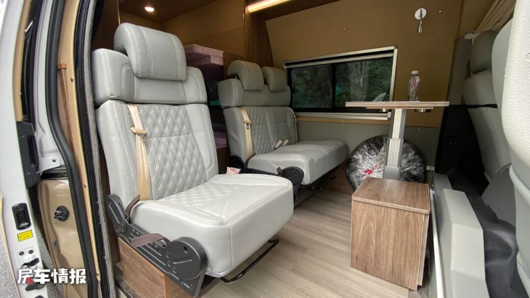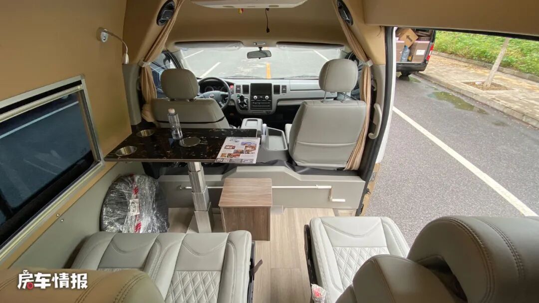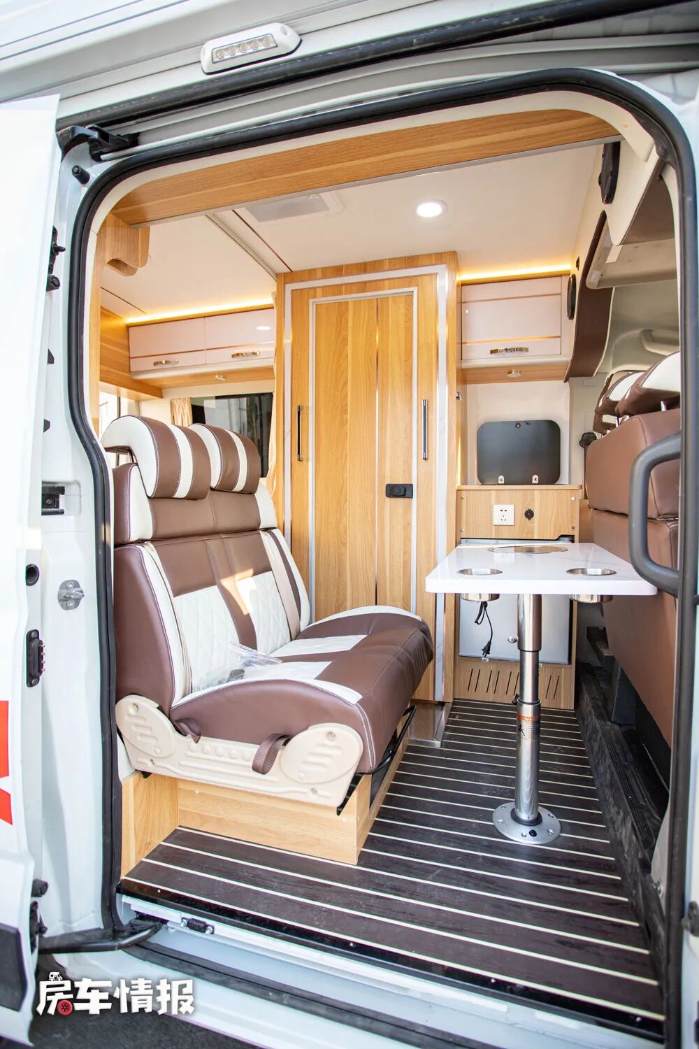 进入车厢内部可以看到与前一款车型不同的是,同样是最多核载5人,但是这款房车采用了1+2的后排乘客座椅设计,双人座椅前也搭配了小型的升降餐桌,满足平日就餐的需求。