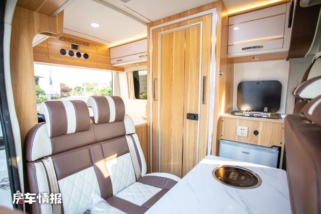 这款房车的就餐区位于副驾驶座椅的后方,采用双人座椅+带有电磁炉的升降餐桌设计,可以更方便后期的使用。