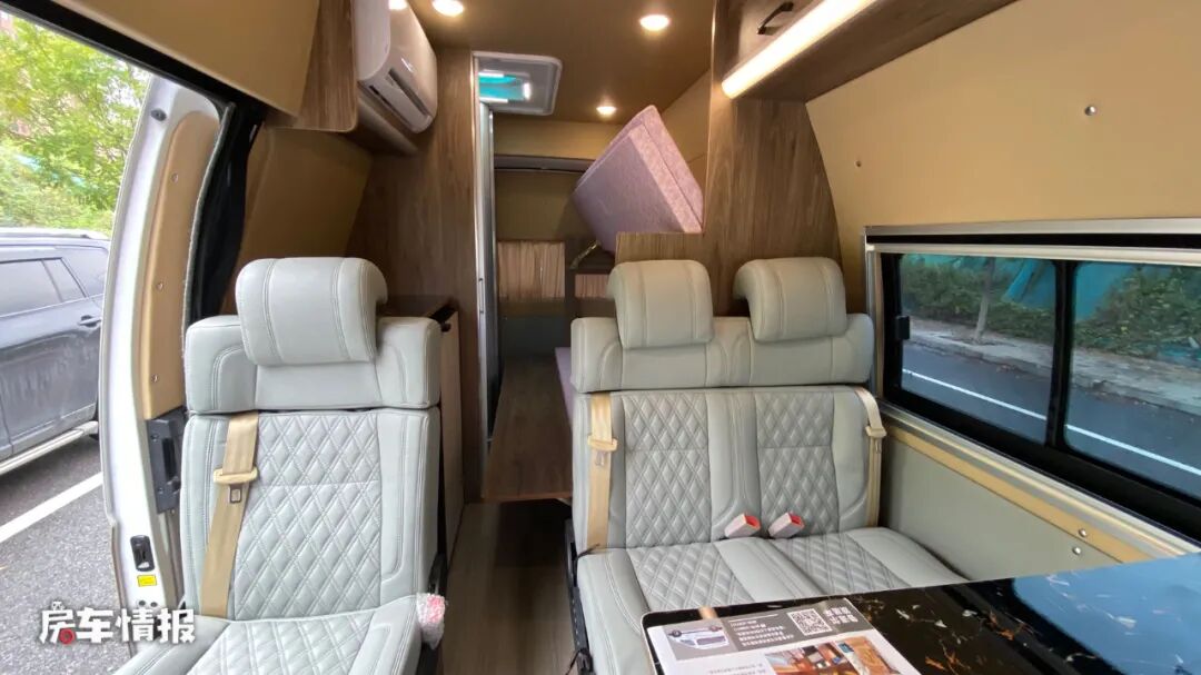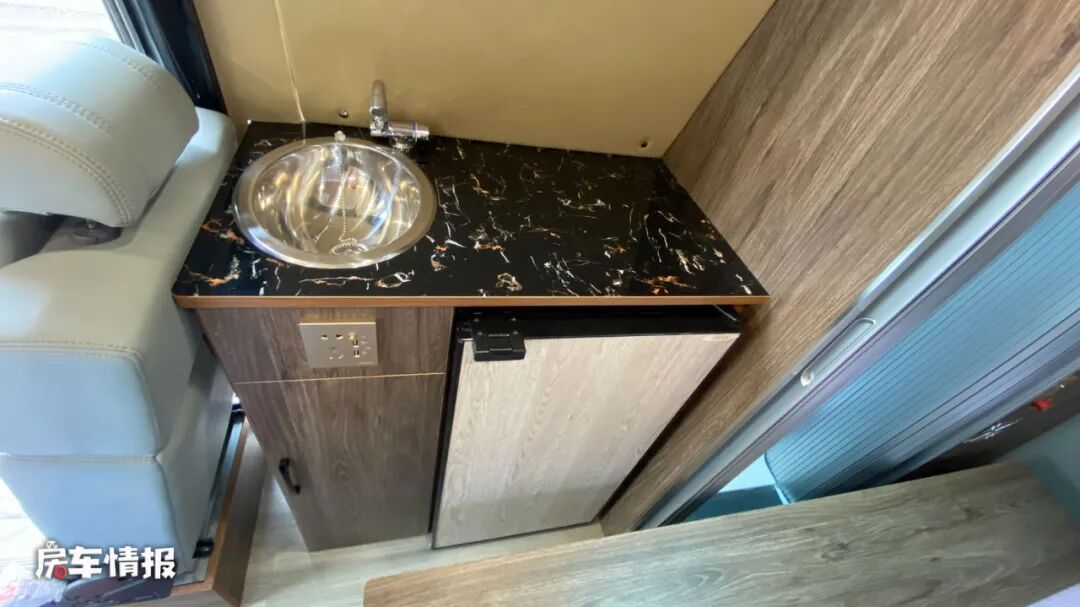靠近乘客门处的单人座椅后方隐藏着全车的厨房操作台,带有不锈钢洗菜池和108L车载冰箱,顶部还配置了一台家用变频空调。