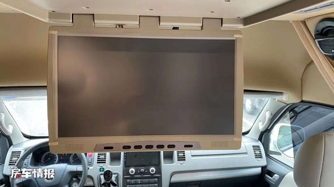 另外在驾驶室上方顶部还提供了一台19寸的吸顶电视,打开电视坐在会客区就可以享受休闲娱乐时光了。