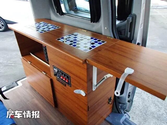 而与沙发相对应的另外一侧则是全车的功能区,平时的状态为一长条桌,需要做饭的时候就可以上翻桌板得到隐藏在下方的洗菜池,同时搭配随车配置的卡式炉,也可以满足出行基本的烹饪需求,另外在桌板的侧面还带有延展的小桌板,也可以简单的备菜使用。而桌子的正面也提供了翻折的小饭桌,平时驻车之后简单的在车厢里就餐还是可以满足的。