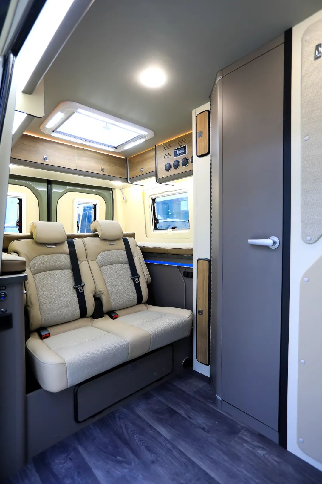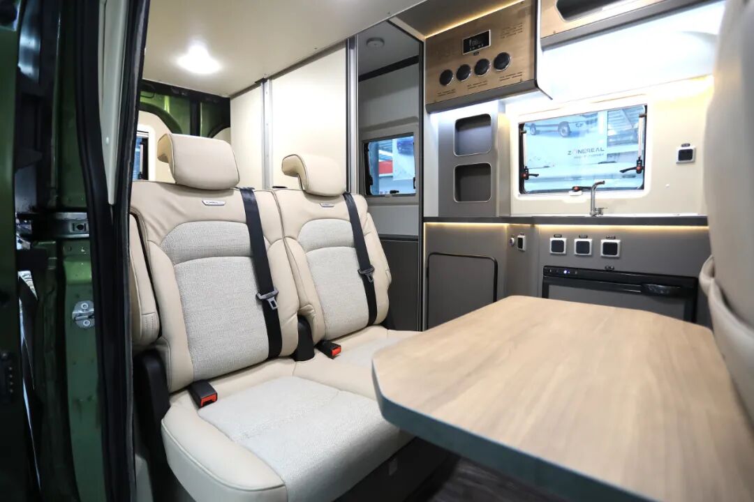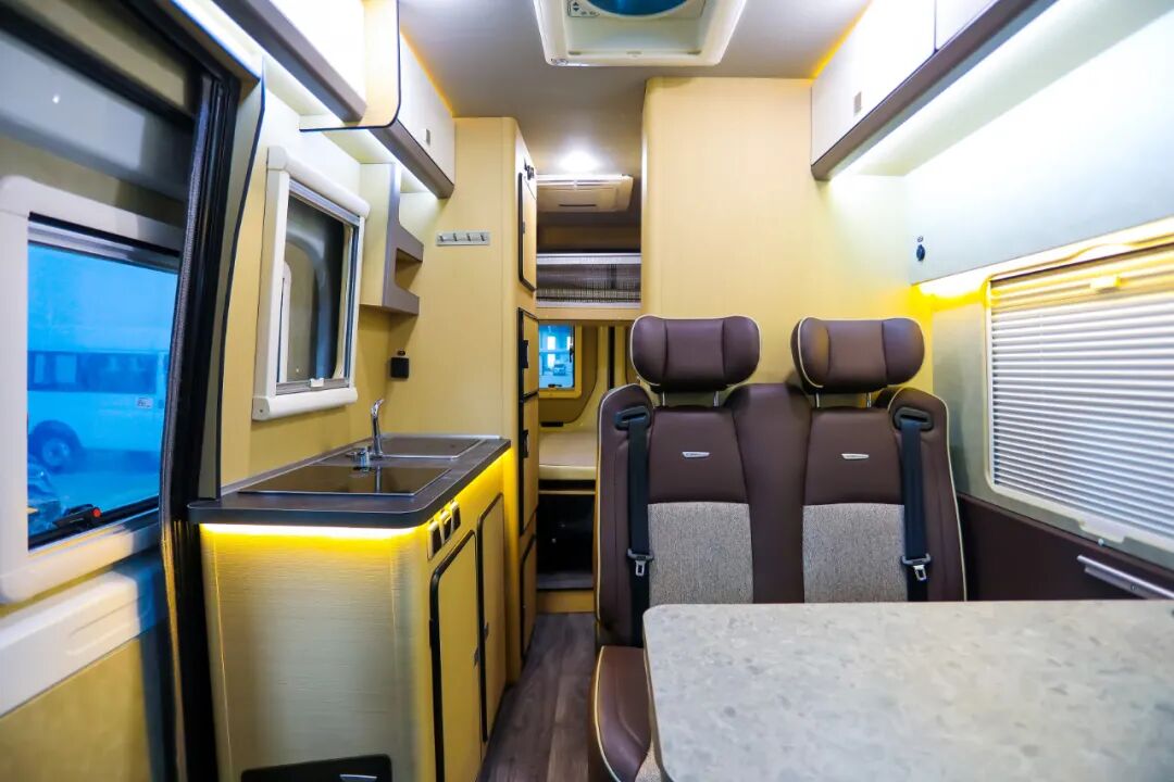 让舒适度更高的品质房车。景宴•栖550采用上汽大通V90长轴高顶底盘,可选6速手动/自动变速箱,搭载2.0T上汽π发动机,能达最佳燃烧效率。最大功率110KW,峰值扭矩375N•m,最高车速150km/h,油箱容积80L、尿素罐容积20L,核载4~5人,采用前置前驱后单胎,传动效率高,全承载式框架结构轻量化车身,强度高,质量轻。满足国六排放标准,C证蓝牌即可驾驶。