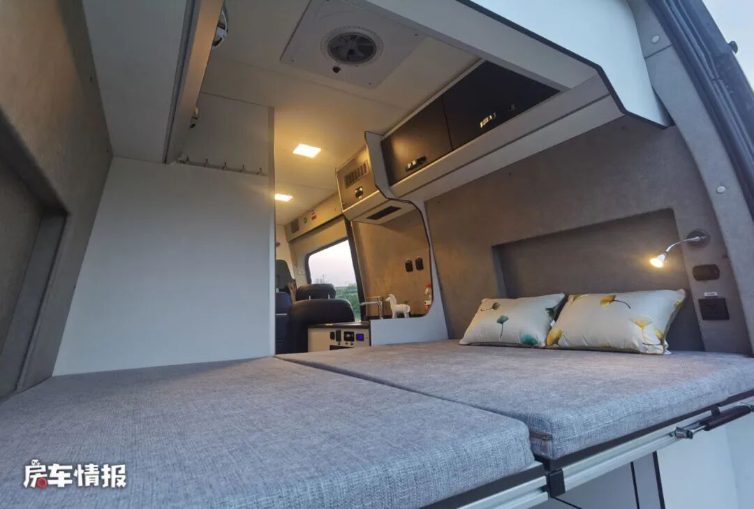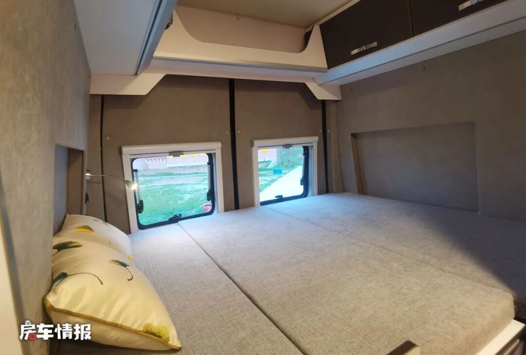 最后是位于车厢尾部的休息区,采用的是比较主流的横置双人床的设计,因为两边的窗户做了盲窗处理,所以也增加了双人床的横向长度,同时也提供了可以存放换洗衣物的吊柜以及挂钩。