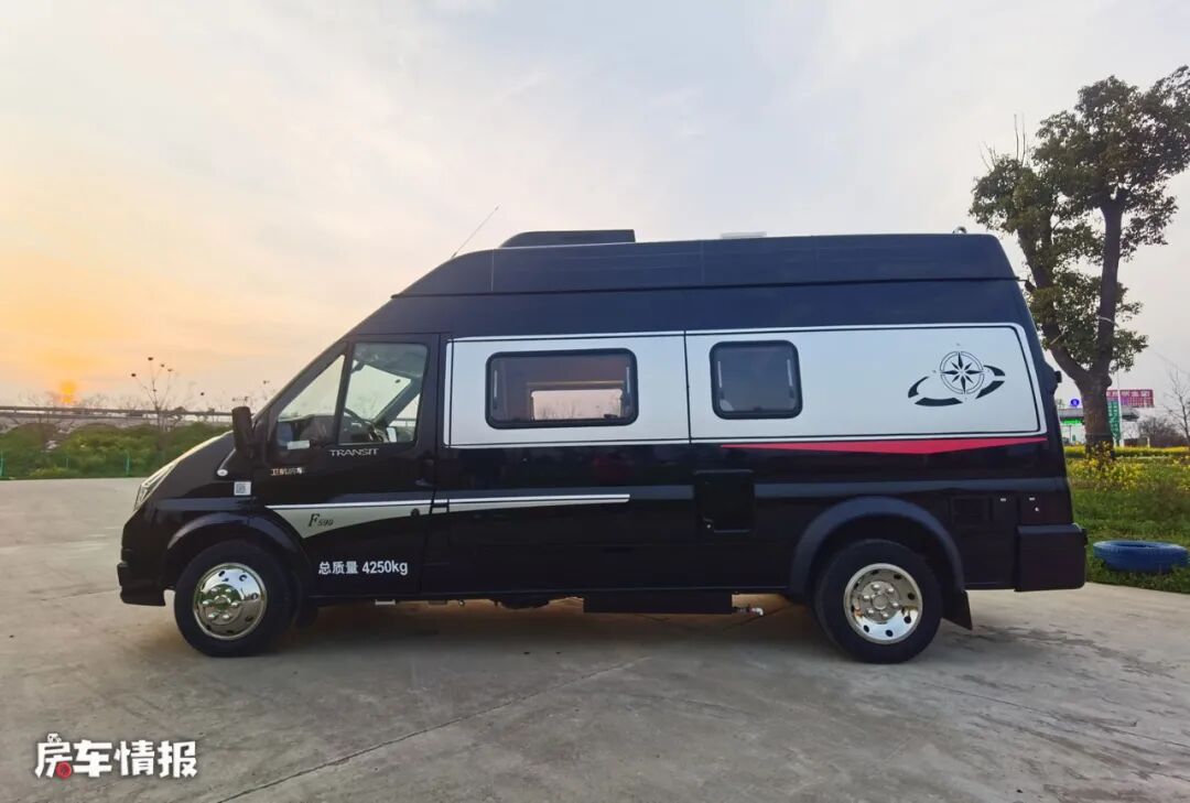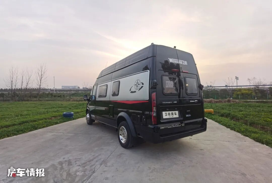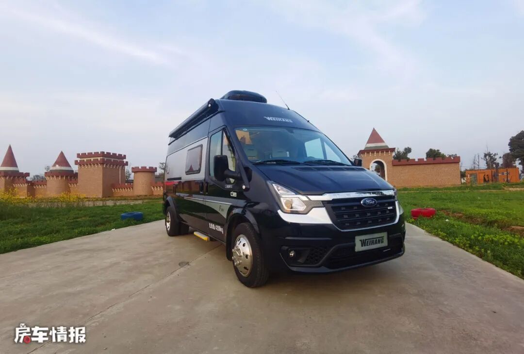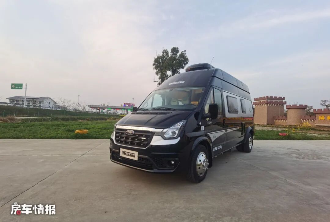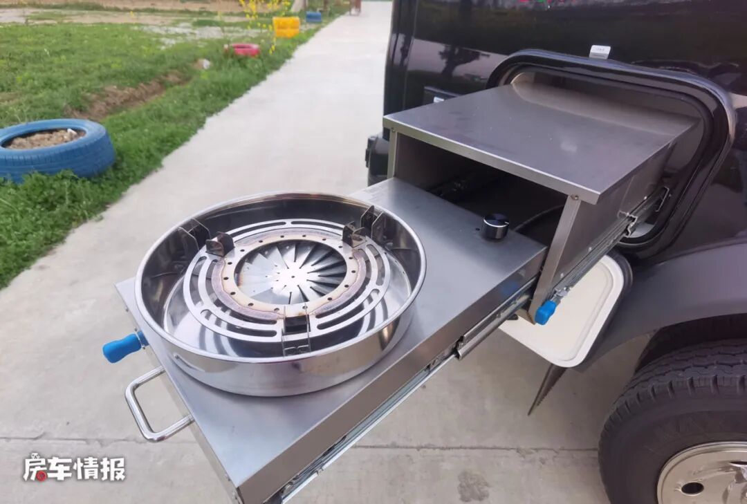 整车以黑色为主色调,车窗加入了银色的处理,包括前方车灯大方以及车身两侧都带有简单的银色彩条,点亮了低调的外观,同时在车身外部也配置了手动遮阳棚以及后方还提供了一个抽拉式的外置灶台,以满足日常需求。