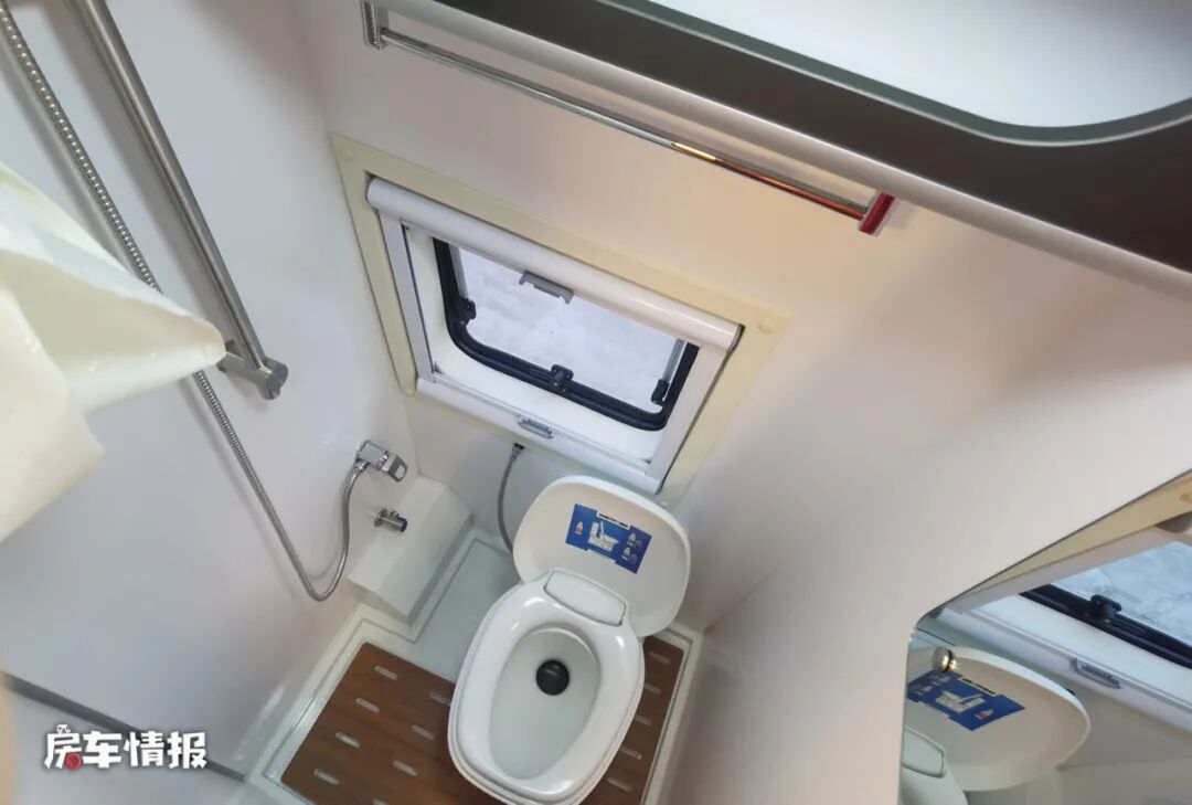 里侧座椅后方是一间独立的卫浴室,虽然整体的面积不能媲美C型房车,但还是可以容纳一名成年人使用的,并且也配置了比较完善的设施,包括马桶、淋浴花洒、梳妆镜和毛巾架等,满足基础的出行洗漱需求。