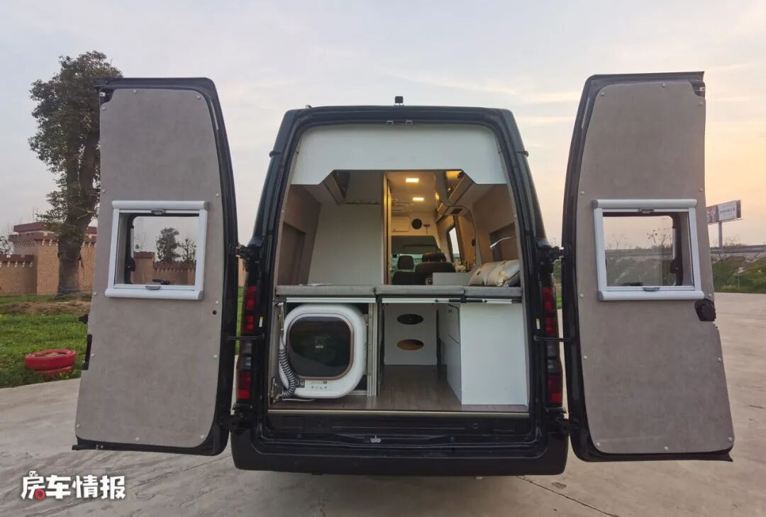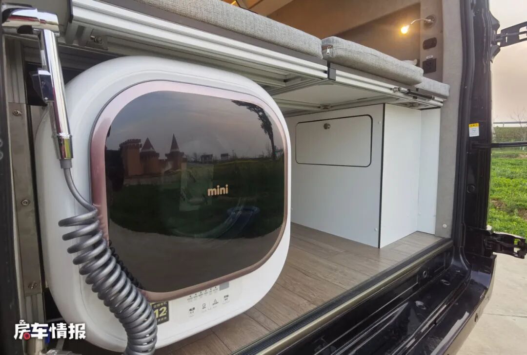 打开可以180度平开的后尾门,还可以看到隐藏在双人床下方的一台洗衣机,也能满足基础的洗衣服需求,而床板下方的空置区域也可以存放大件的行李,以提升整车的储物能力。