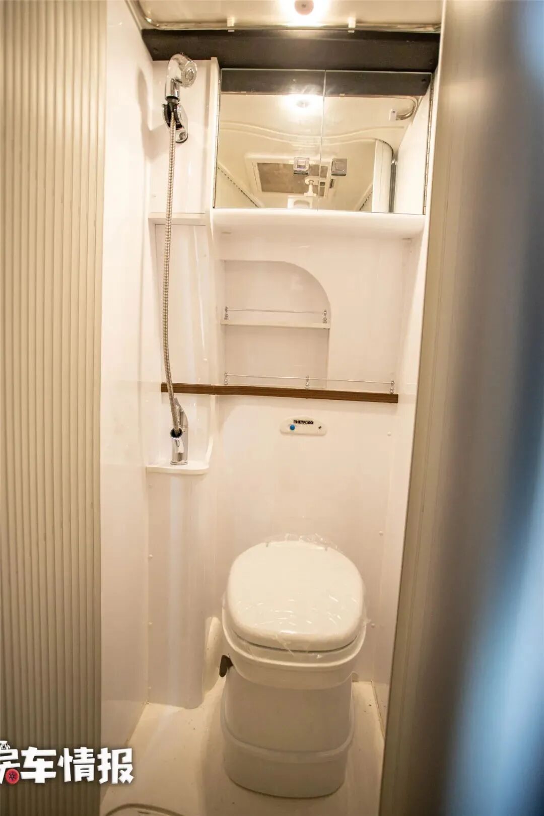 与之相对的是一间带有卷帘门的卫浴室,使用的时候可以打开卷帘门,就可以把车厢过道一同拓展到卫生间里,内部空间容纳一个人使用还是没问题的,提供了马桶、淋浴花洒、梳妆镜、换气扇等基础设备,满足日常的洗漱需求。