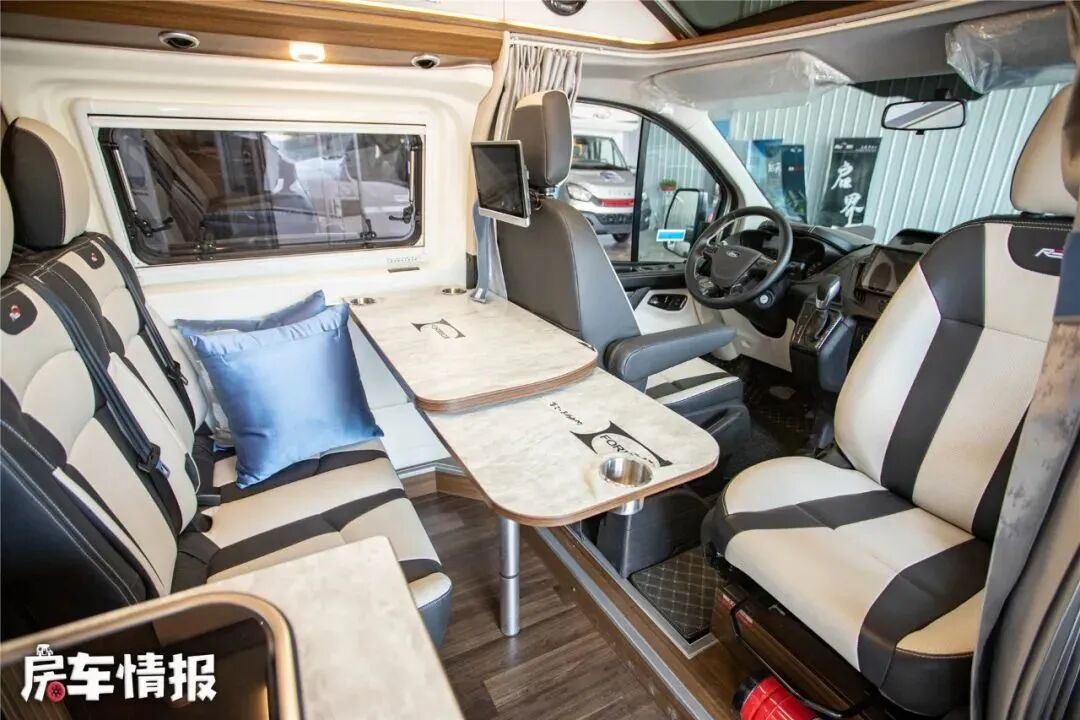 会客区采用了B型房车中比较主流的双人座椅+折叠餐桌的设计,座椅的靠背带有可调节功能,也提升了长途行驶中乘坐的舒适性,另外在前方驾驶室中的副驾驶座椅也可以向后旋转,与后方形成面对面的布局,也适合偶尔的会客需求。另外匹配的折叠餐桌在驻车以后也可以固定到侧滑门外部,形成一个外置餐桌,使用比较灵活。主驾驶后方还提供了一台比较小巧的电视,也可以带来基础的娱乐需求。