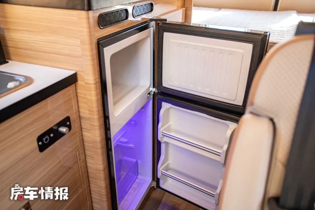 由于整车的长度临界6米,所以车内的厨房操作台的面积也比较宽敞,而且采用了高低台面的设计,因为车外配置了燃油灶,所以车内只提供了基础的不锈钢洗菜池,以及一台133L的上下双开门冰箱和一些基础的储物空间。