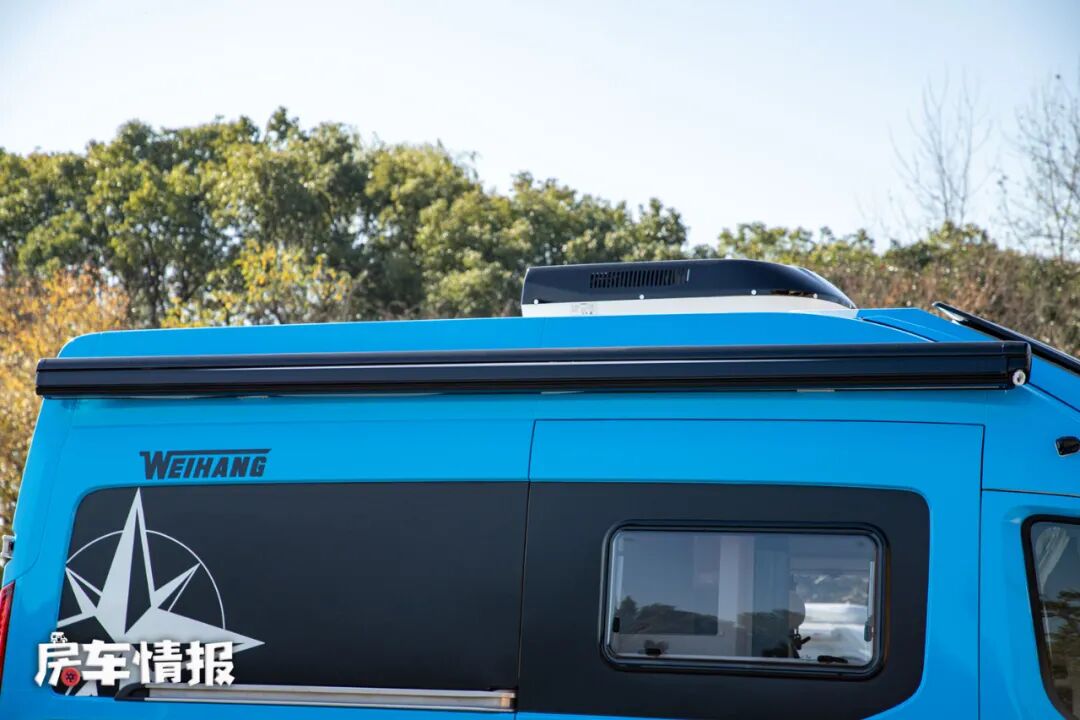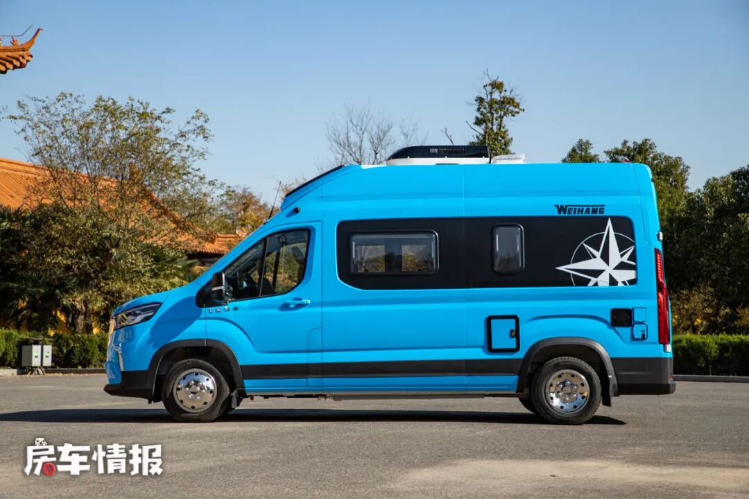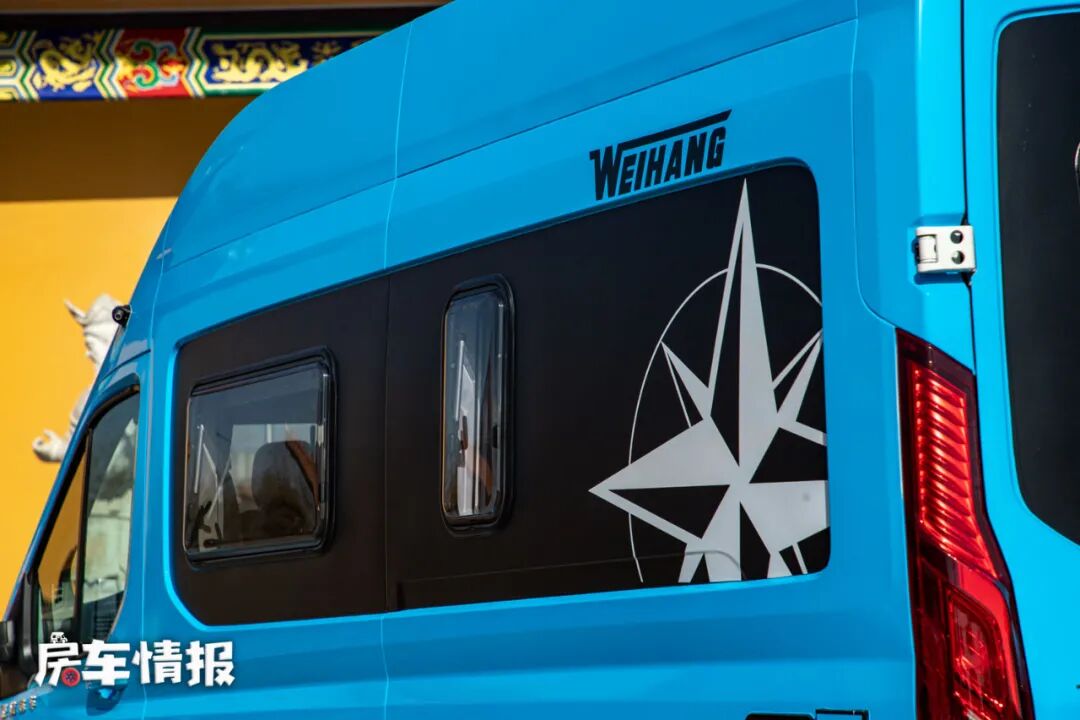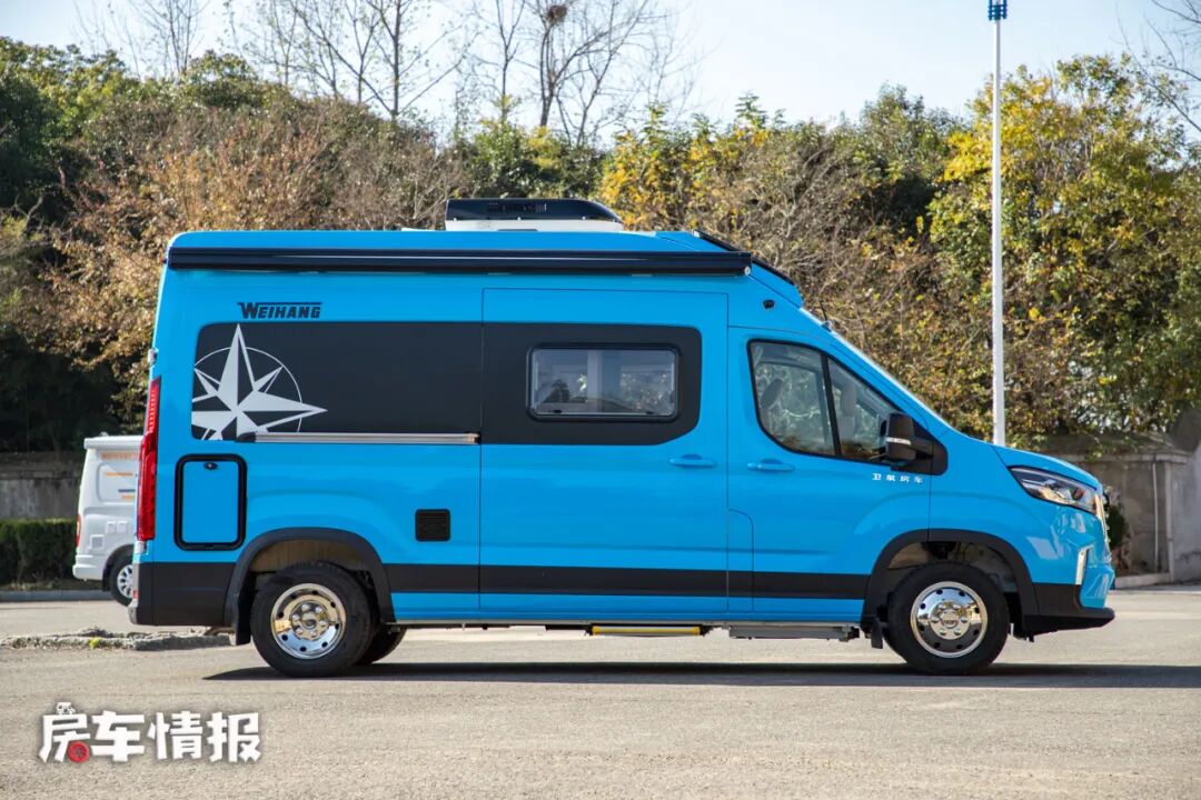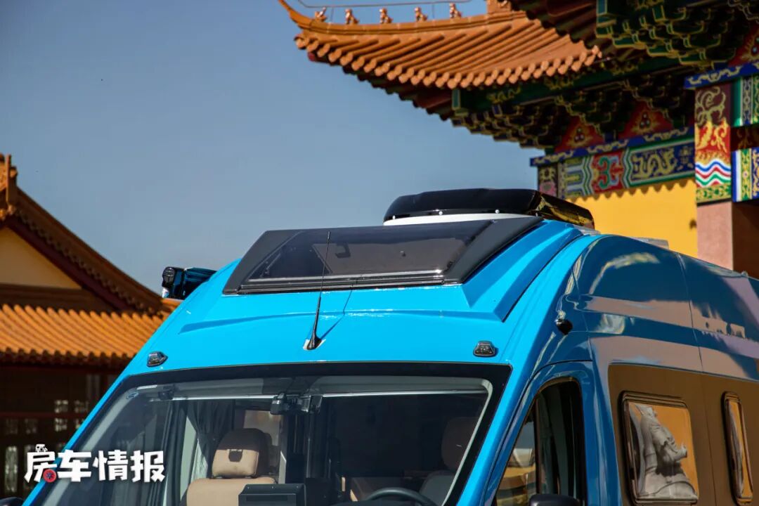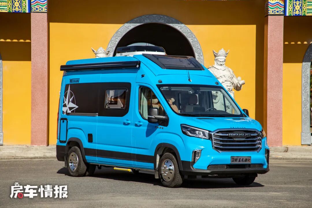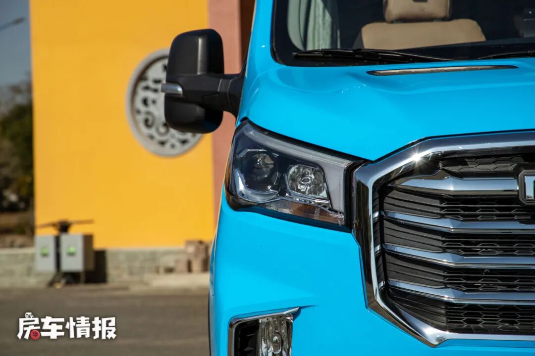 首先从外观上,这款房车就超级的吸引眼球,靓丽的冰川蓝色,对于颜控来说第一眼就会爱上它,搭载大通V90的底盘,自带霸气的横幅式前格栅,让这款车散发着独特的魅力。