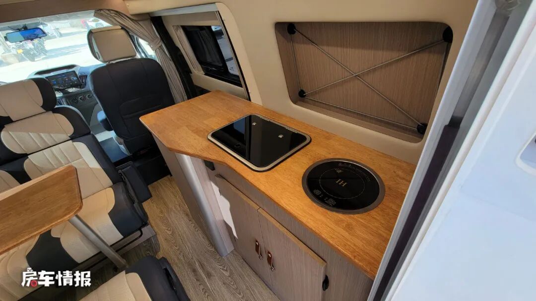 位于乘客门处的超大尺寸厨房区域,这在C型房车中也很难看到,台面上带有基础的电磁炉和不锈钢洗菜池,侧面还嵌入了一台上下双开门的冰箱,可以满足分类存储食材的需求,同时上方空置的区域还可以用来备菜。