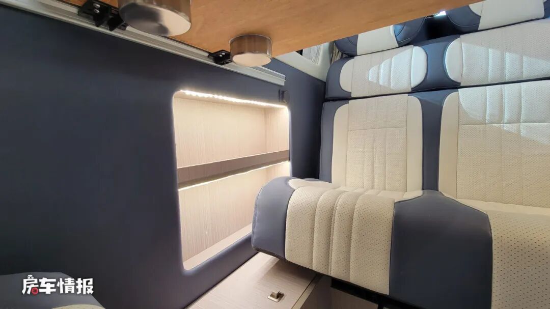 车内并没有一个固定的床铺,而是采用了会客区和休息区二合一的设计,平时状态下为四人对卡座+折叠餐桌的模式,旁边墙壁上还带有开放式的储物格,可以存放一些基础的物品,晚上睡觉的时候则可以将其互相拼接,组合成一张尺寸为1900*1200mm的沙发床,身材较瘦小的两个人还是可以躺下的。