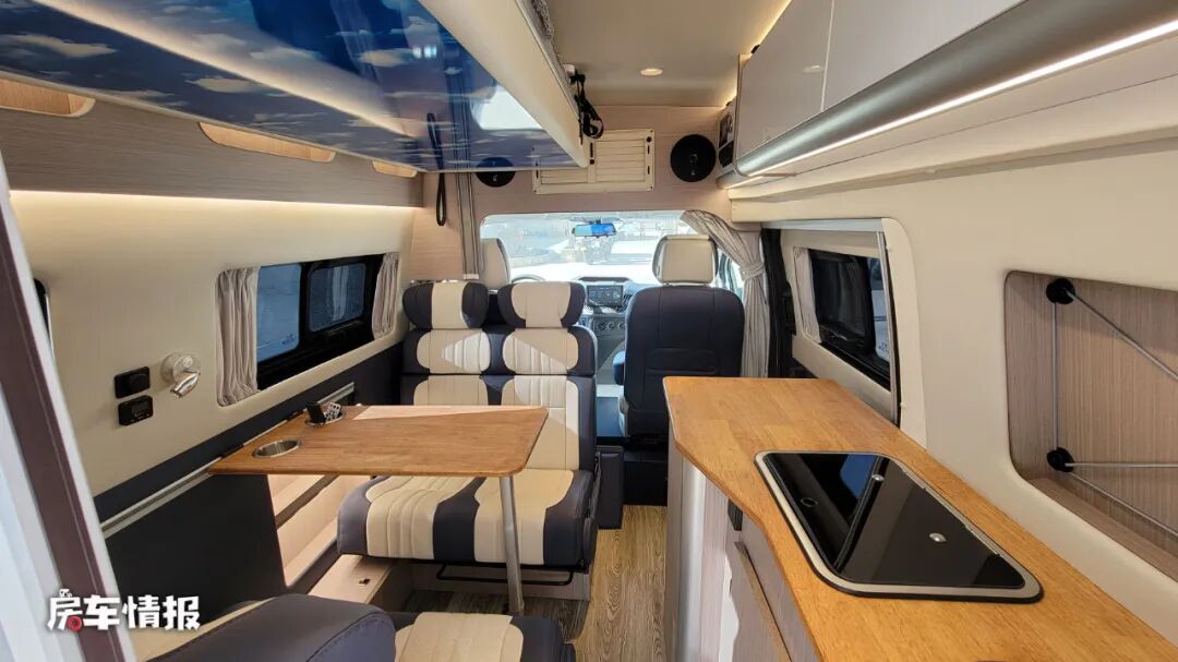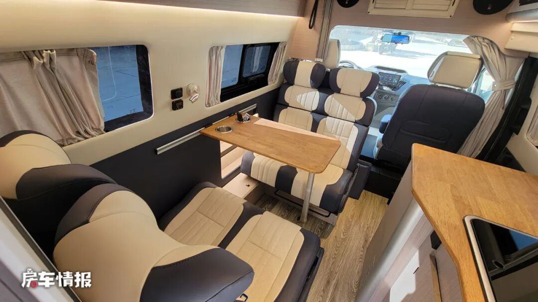 进入车厢内部,整体的设计还是比较商务风的,因为受底盘自身的限制,所以并没有C型房车中那么宽敞,不过如果两个人在驻车时使用还是完全没有问题的。