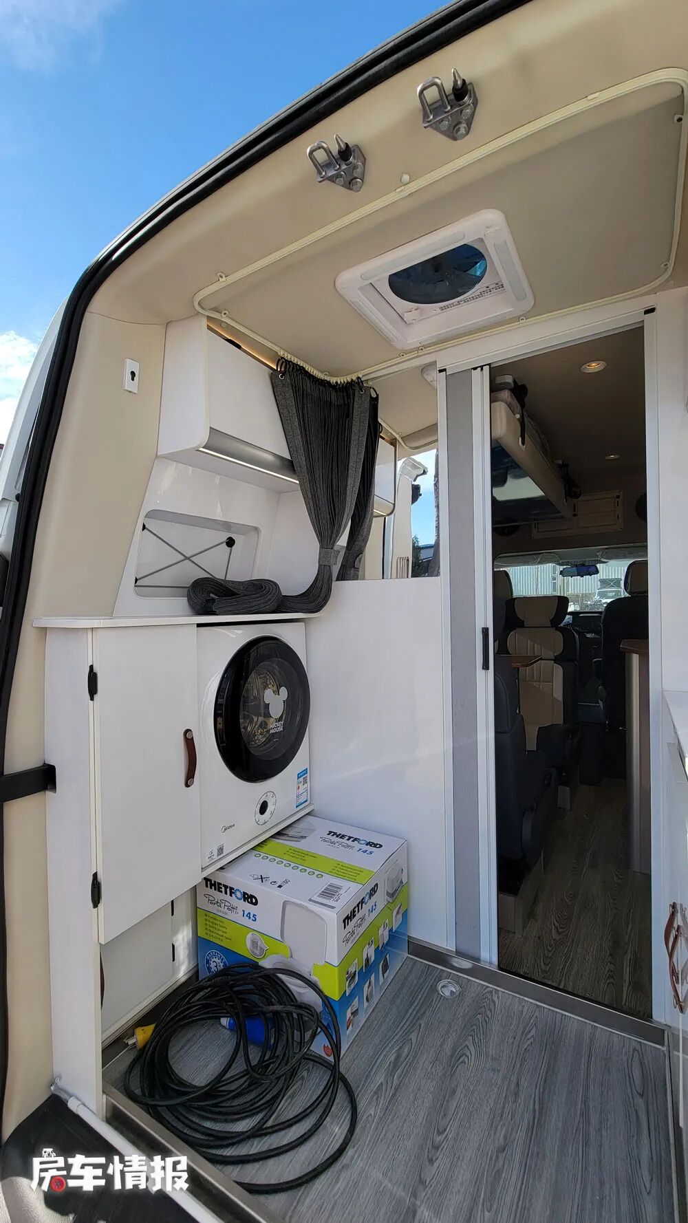 最后是位于车厢尾部一间独立的卫生间,与前方的生活区有推拉门相隔,一侧是带有基础的洗手台,另一侧则是一台嵌入了mini洗衣机的储物柜,同时全车还提供了一台便携式的马桶,以满足日常的基础洗漱需求。