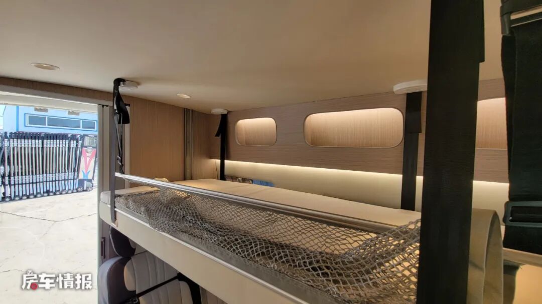 另外这辆车内还提供了一张隐藏在天花板的升降单人床,有应急需求时也可以将其降下,其尺寸为1750*750mm,日常可以睡下一个小朋友。