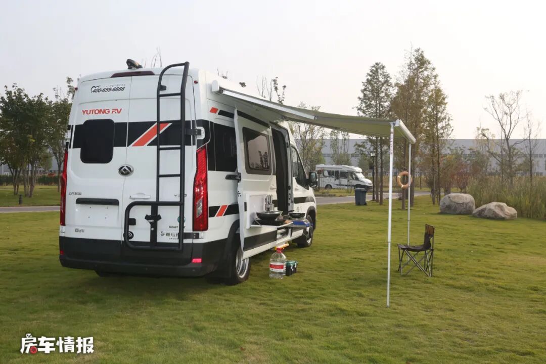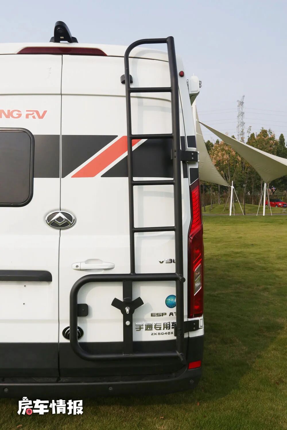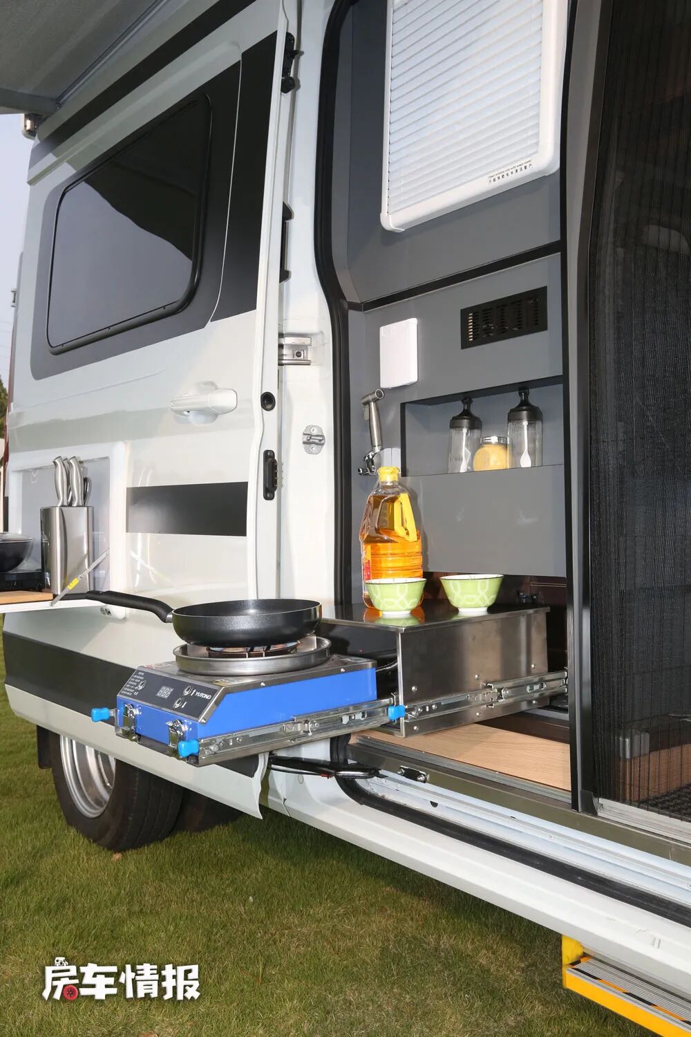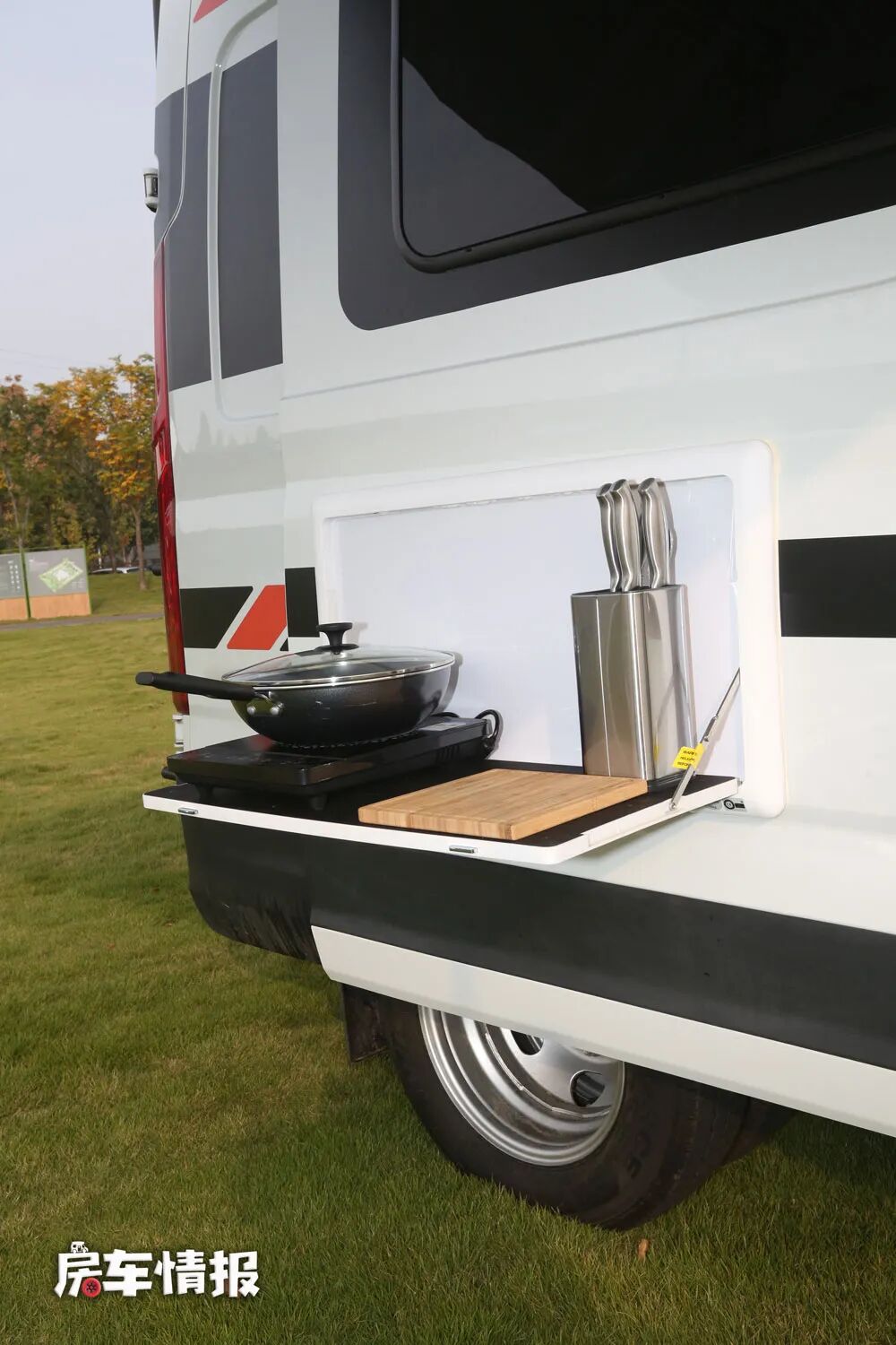 车身外部配置也很齐全,包括上方的遮阳棚,位于侧滑乘客门上的外置翻板,以及厨房操作台外侧的抽拉式灶台和外置淋雨花洒,可以满足日常在外的生活需求,车位后部也配置了登车爬梯,方便日后对车辆进行检查,后期有需要,也可以选装自行车架。