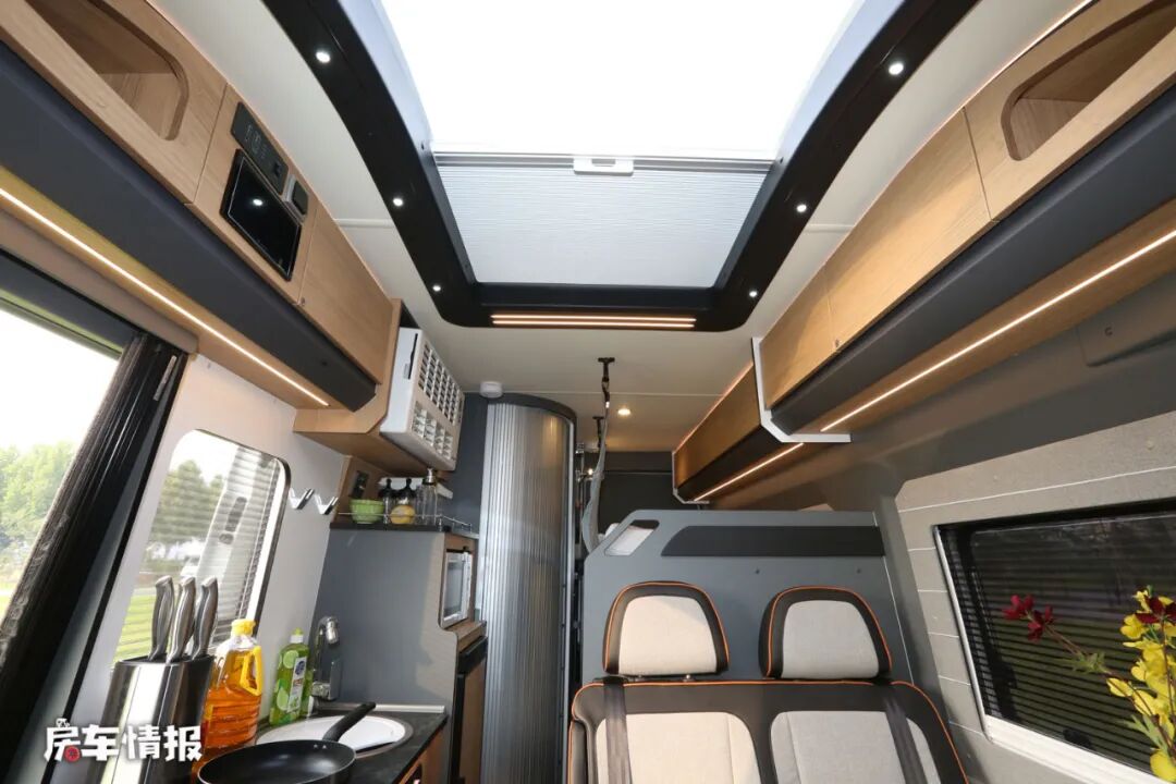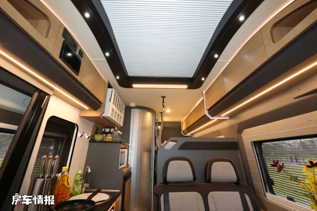 而位于会客区上方的大尺寸天窗,为整辆车带来了非常明亮的采光度和通透性,而且也配有隐私拉帘,当夜晚来临时,拉上拉帘,打开车内灯光,营造出了既温馨又豪华的感觉。