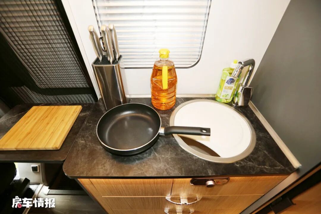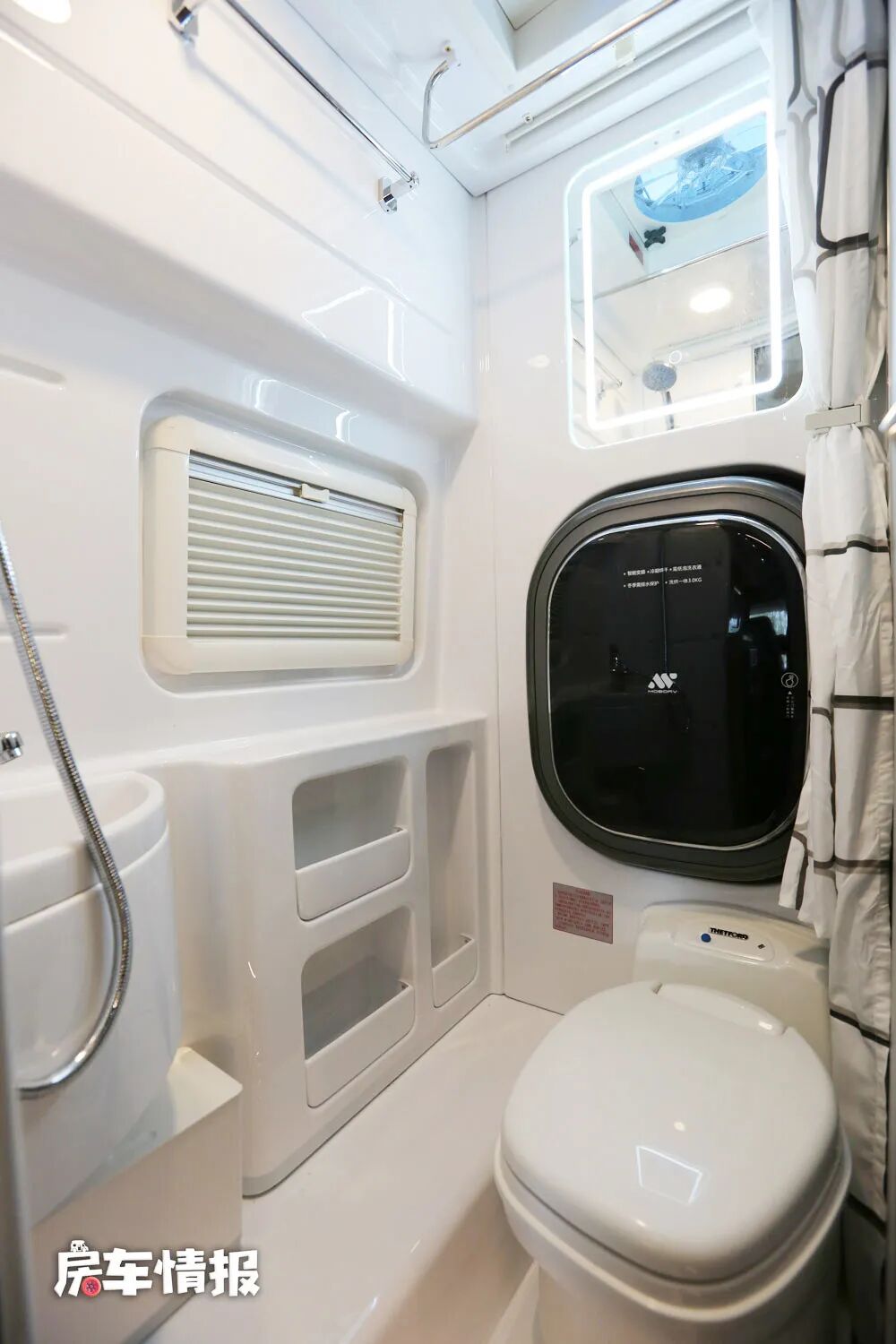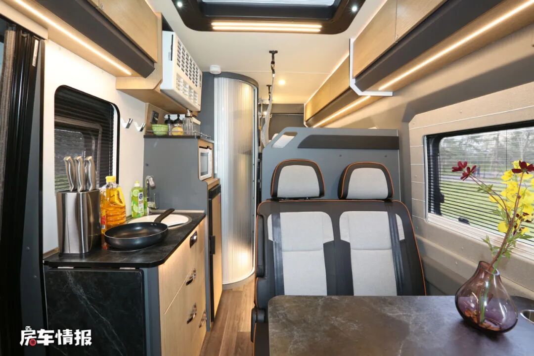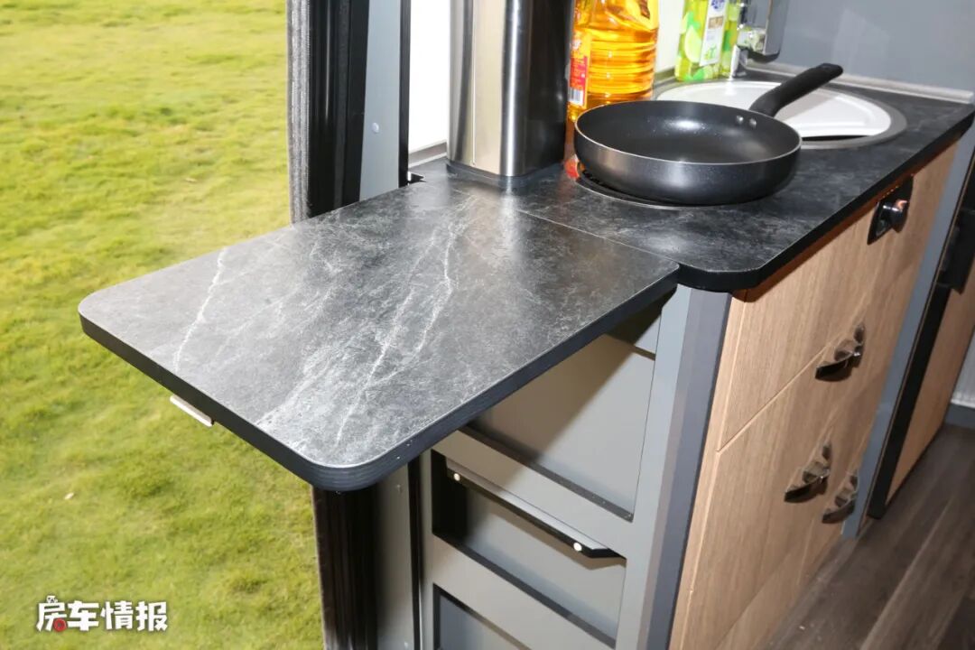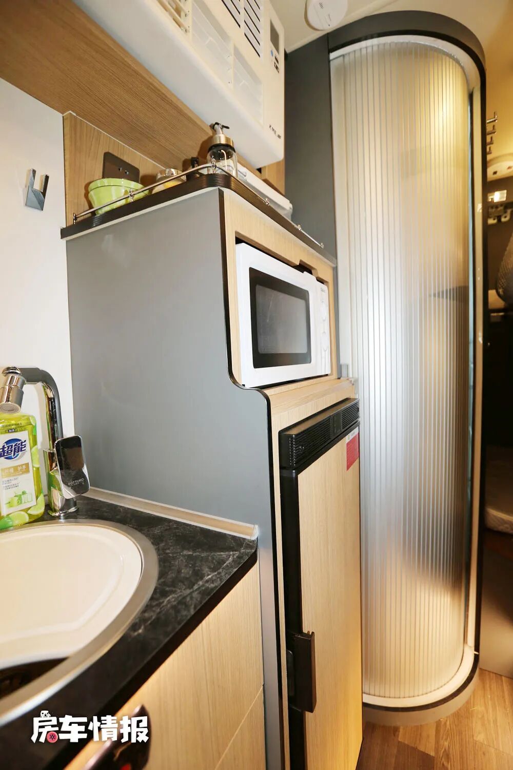 全车的厨房区位于乘客门后方,台面上提供了电磁炉和不锈钢的洗菜池,侧面还带有拓展区域,下方提供了多个储物吊柜,顶部则是一台12V的底置空调,后方还配备了微波炉和一台90L的上下双开门冰箱,车内车外都提供了灶台,所以即便天气不好的时候,也可以选择在车内进行烹饪。