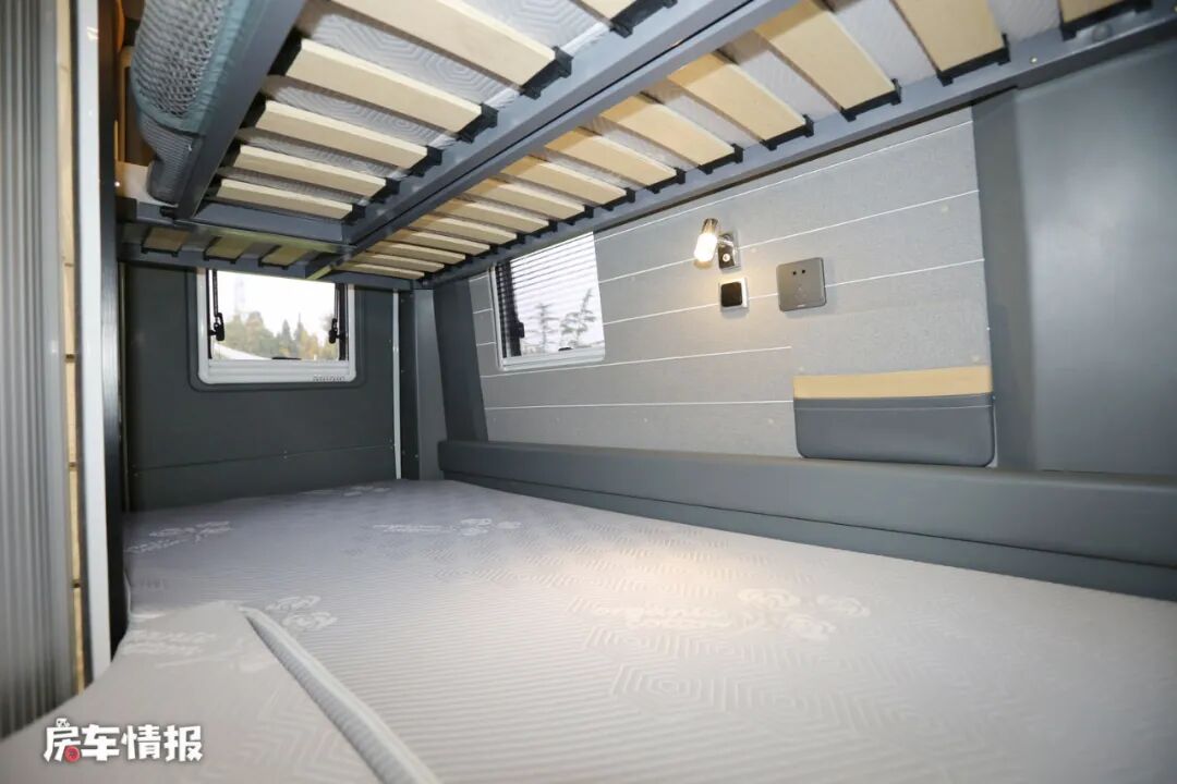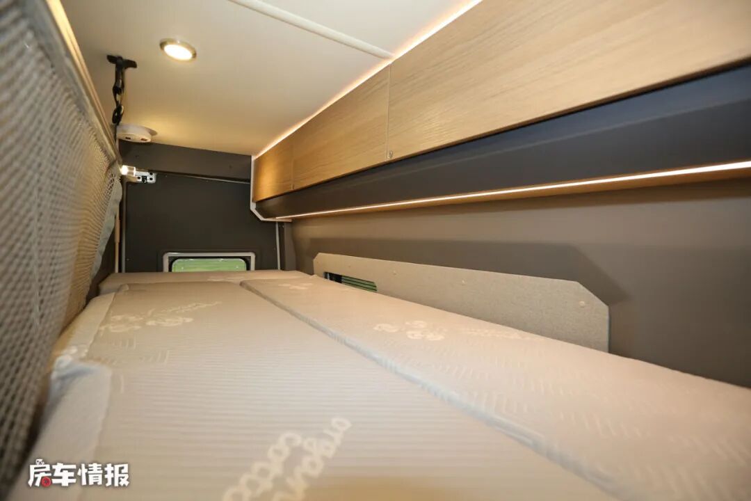 车厢尾部的另外一侧就是全车的休息区了,采用了上下子母床的设计,下床带有拓展功能,最多能够容纳一家三口使用。