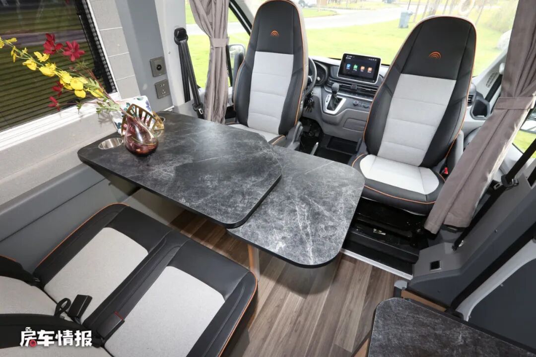 驾驶室后方的会客区域,常规状态下是双人卡座沙发+可拓展的升降餐桌,但是因为主副驾驶座椅都加入了可向后旋转的功能,所以最终可呈现四人会客区的模式,而且乘客座椅全部进行了升级,采用乘用车座椅的设计,不仅可以调节靠背,还可以前后滑移,同时还带有可以放平的功能,也就是说夜晚的时候还可以满足睡卧的需求,提升了整体的实用性。