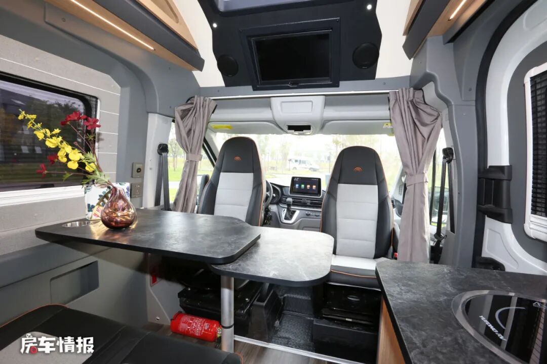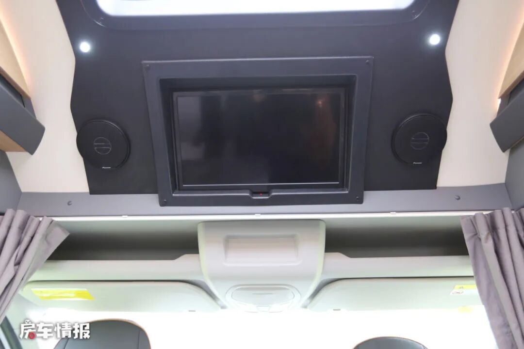 在驾驶室顶部上方还提供了一台19寸的液晶电视,两边还配置了音响系统,闲暇的时候也可以打造成一个私人的小型电影院,提升旅行中的娱乐所需。