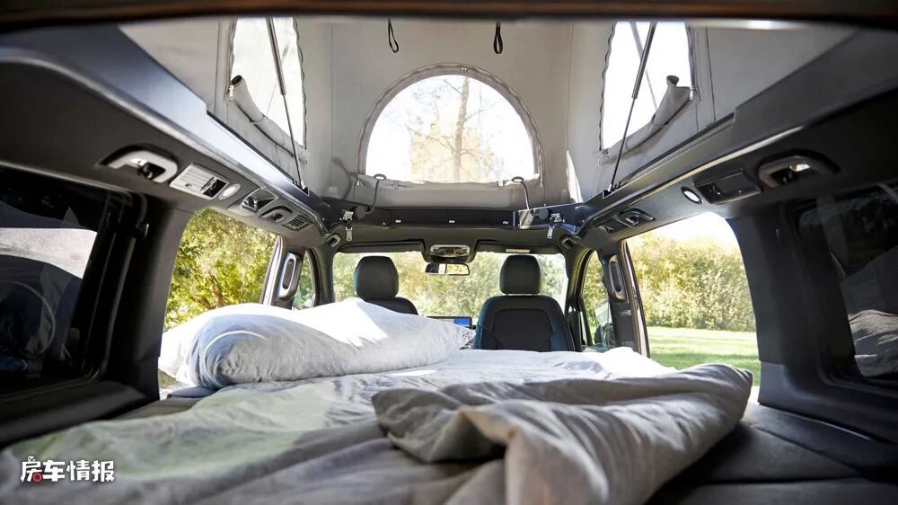说回这款露营车,在顶部加入了软式升顶机构,以保证在车厢内部时可以更加自如的行动,而且升顶三面都带有窗户,所以为车内打造的了采光度极好的环境,另外车厢内也保留了原来的座椅,这样在日常行驶中也可以乘坐,到了晚间则可以转换成一张平整的双人床铺,用来满足基础的睡眠需求。